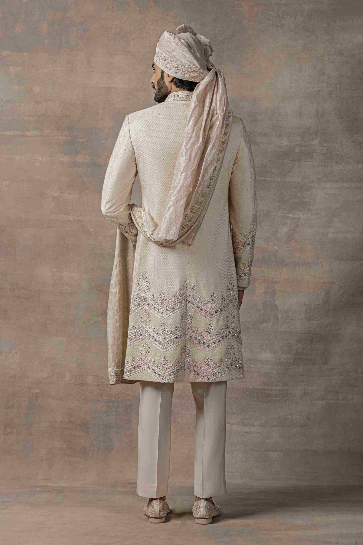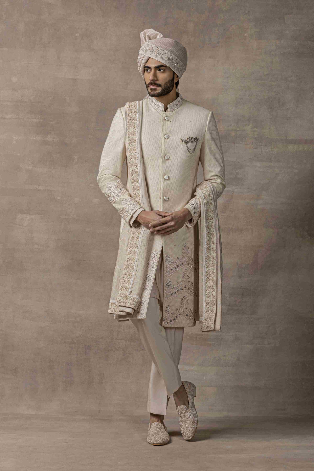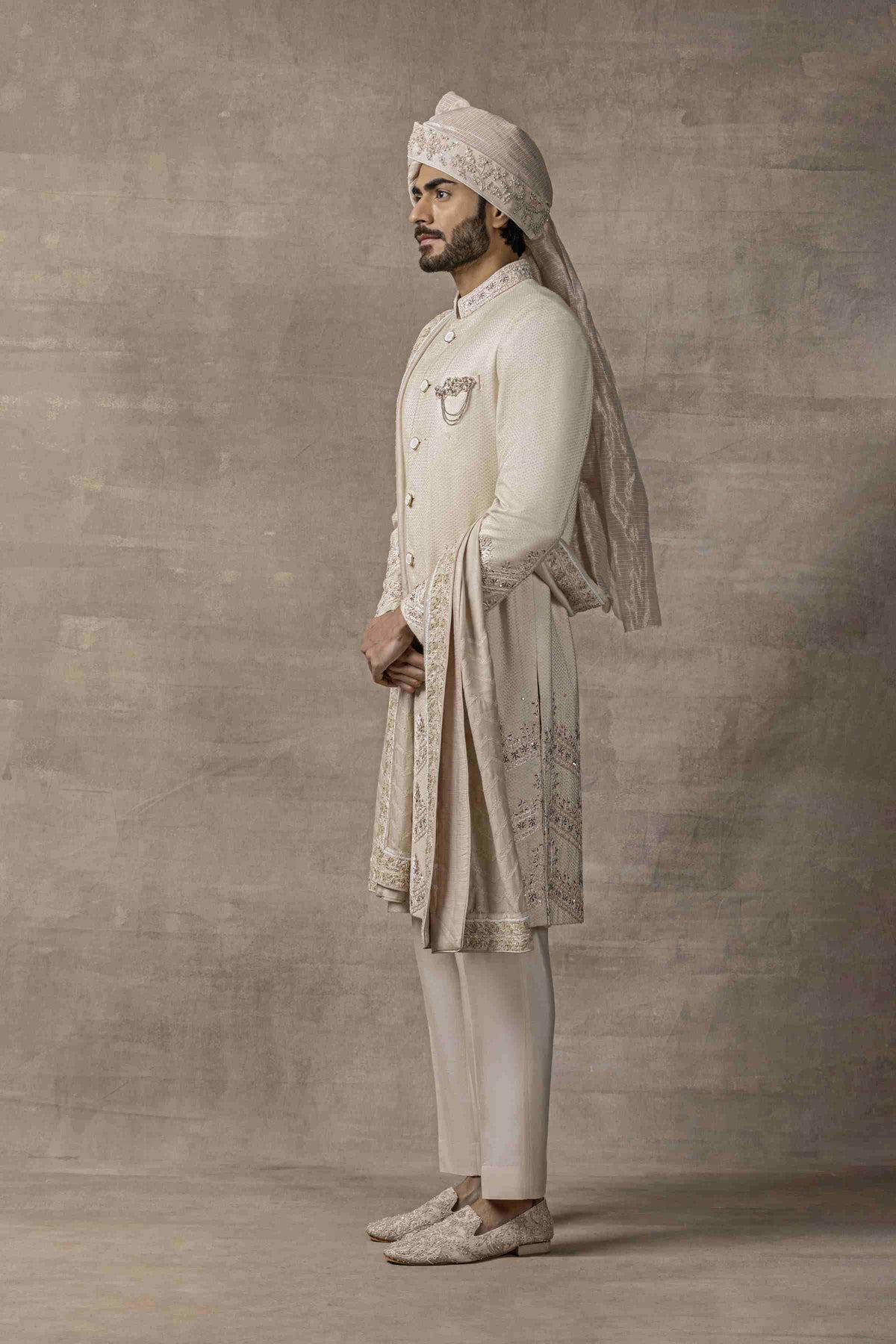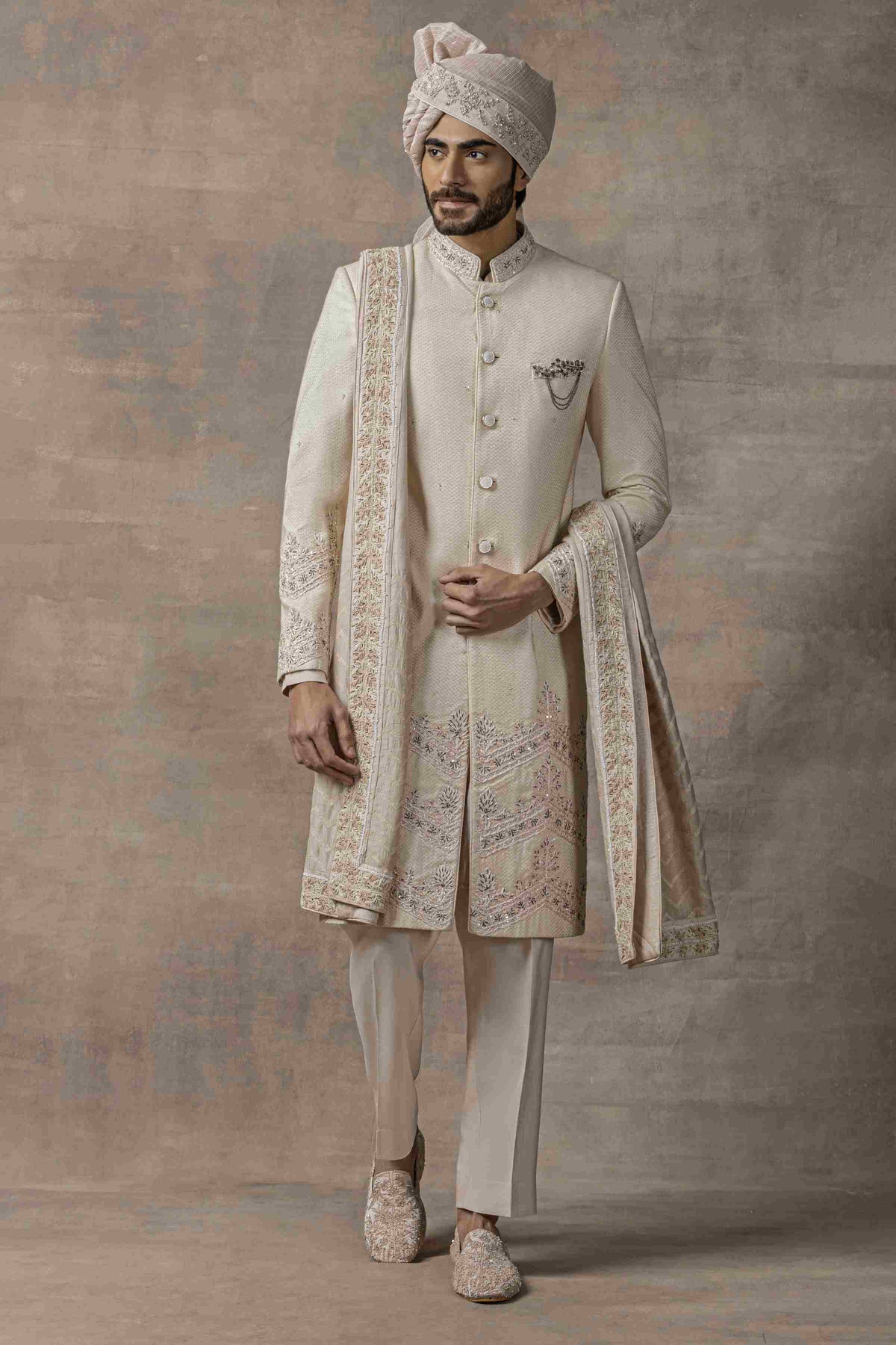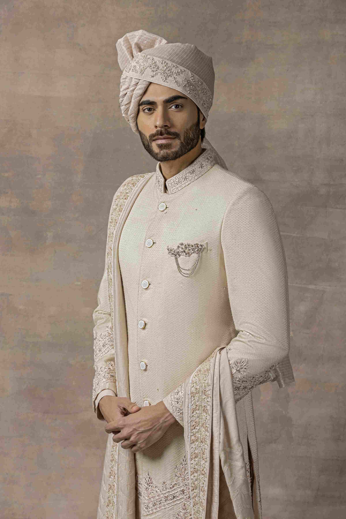 Featuring Peach Sherwani With Thread And Pearl Detailing Paired With Pants , Kurta, Shoes, Dupatta & Safa Fabric