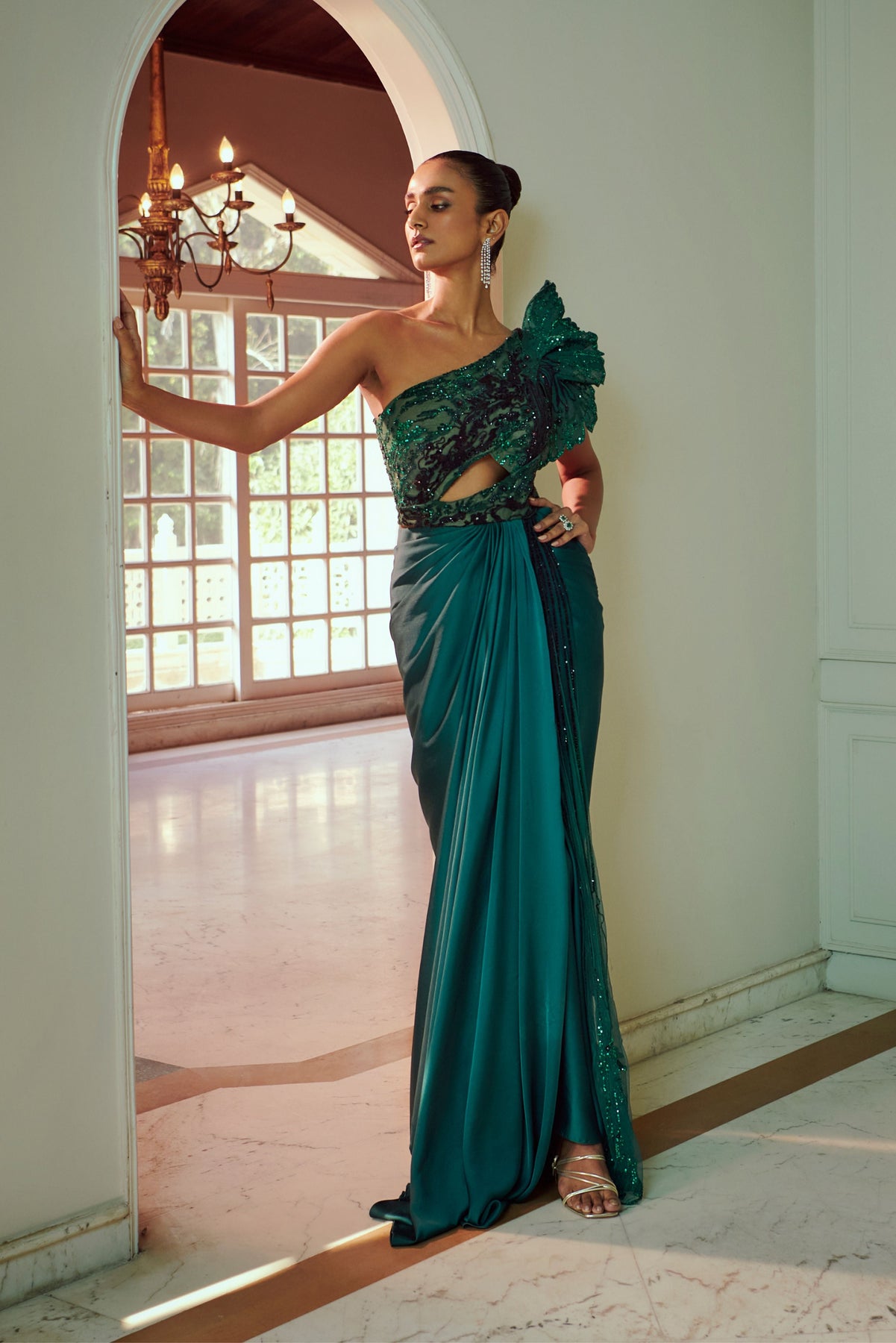 Pre-drape saree with an asymmetrical modern cut bodice, alluring embroidery and elegant drape of satin crepe.