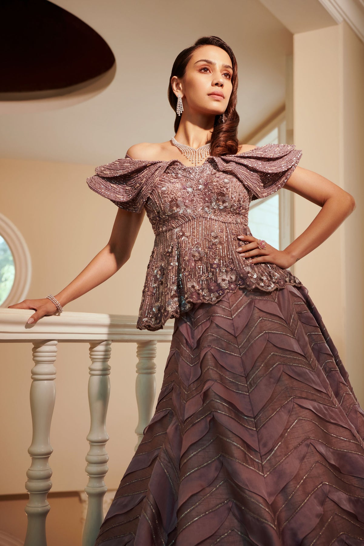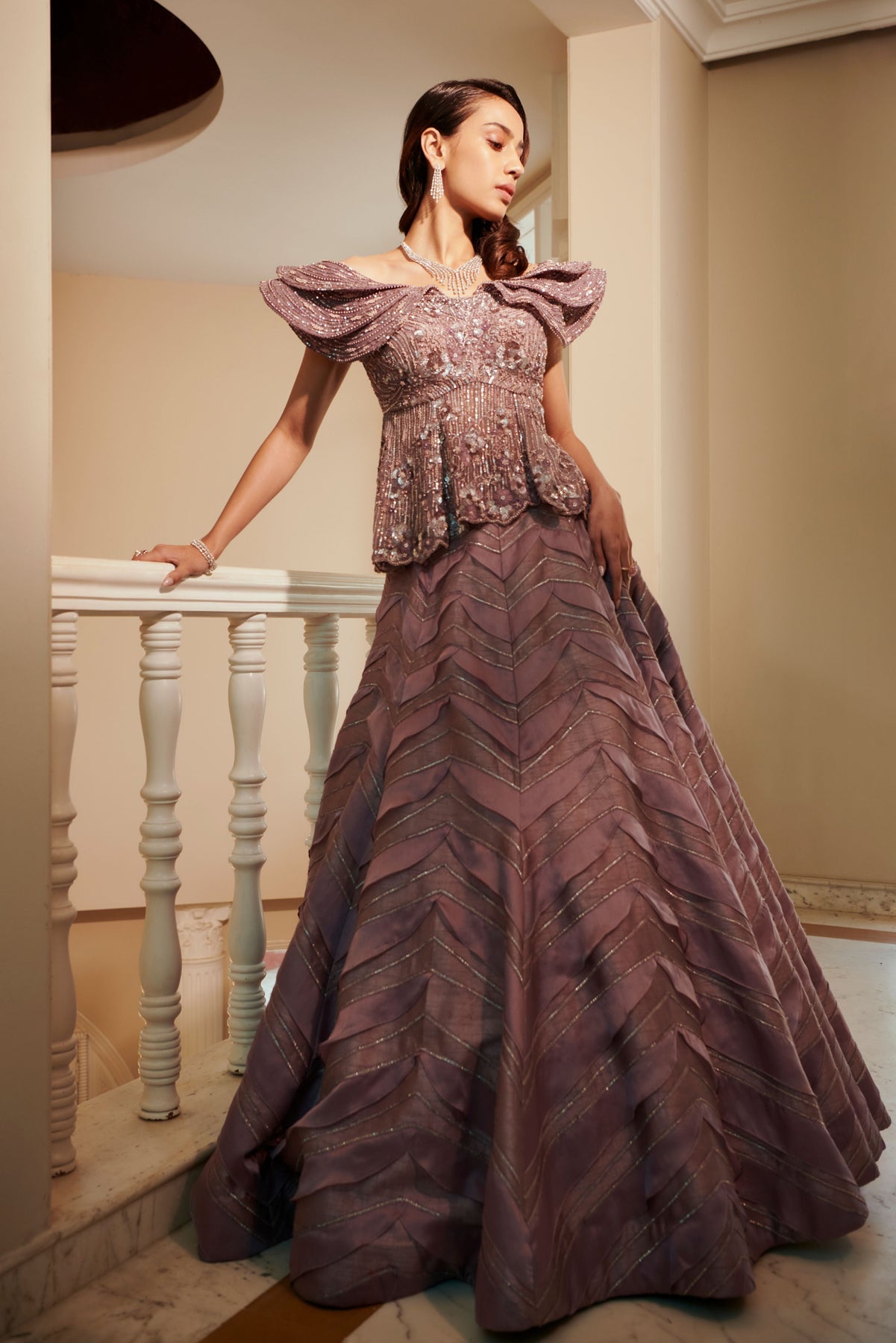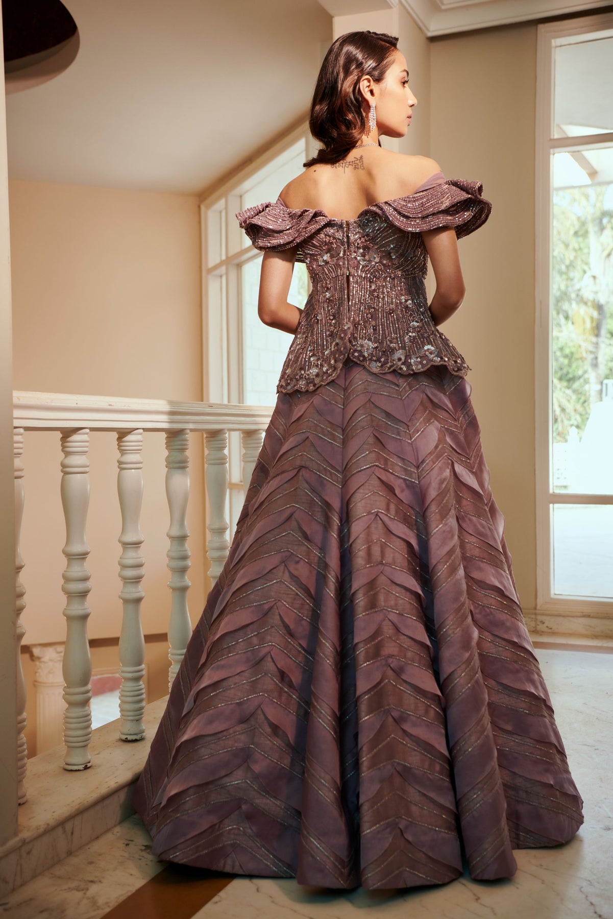'Stardust Glittered Skirt & Top' is from On The Wings Of Love collection by Adaara Couture. This comes with an embroidered Peplum bodice and skirt having organza ruffles placed rhythmically . It has structured shoulder details which is emphasizing the overall silhouette.