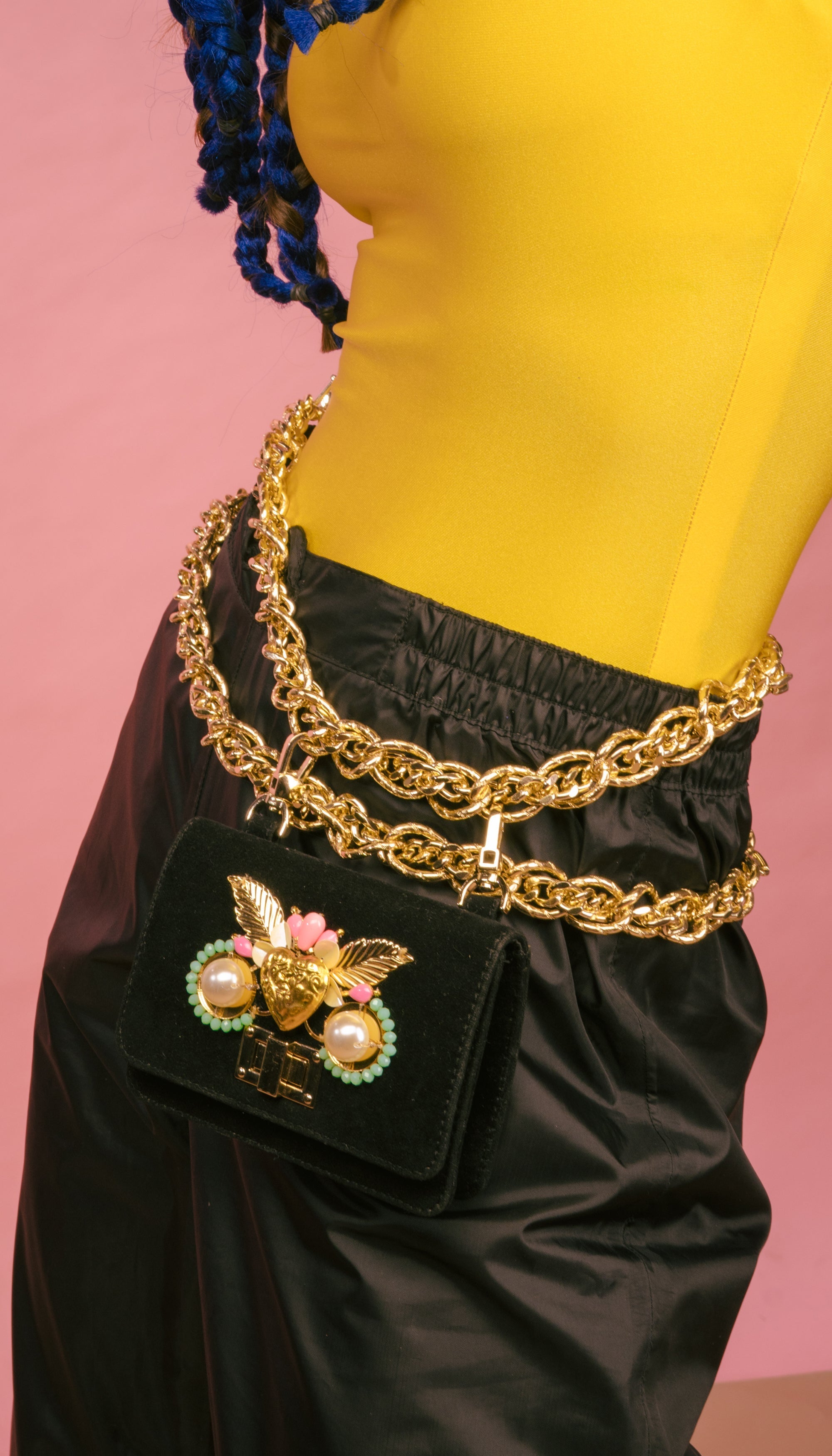 'Black Suede Chain-Link Belt-Bag' is from Bags collection by Papa Dont Preach. Black suede chain-link belt-bag with embellished motif.