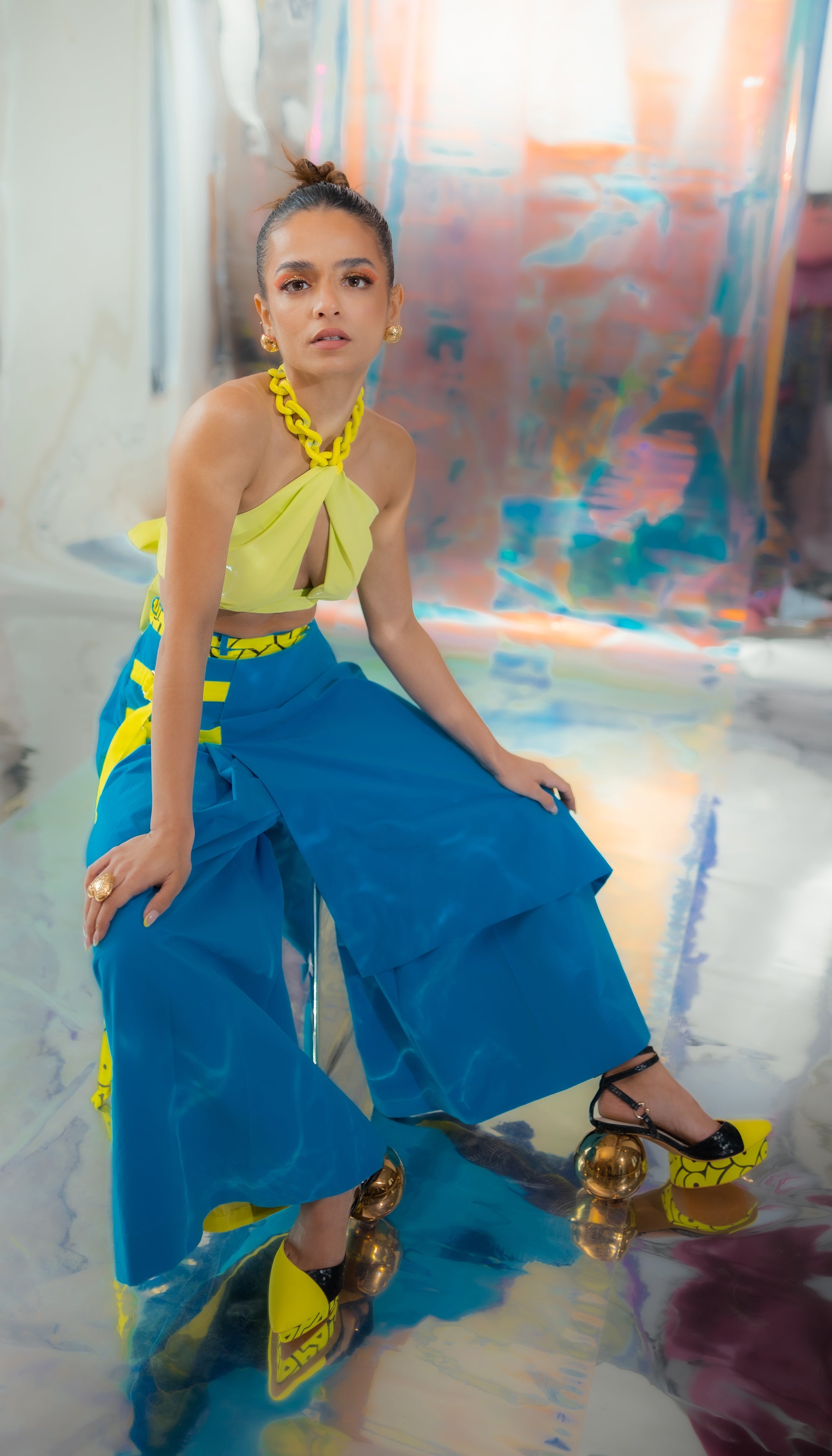 Japanese style pants in cerulean blue with contrasting straps in our driving me crazy print