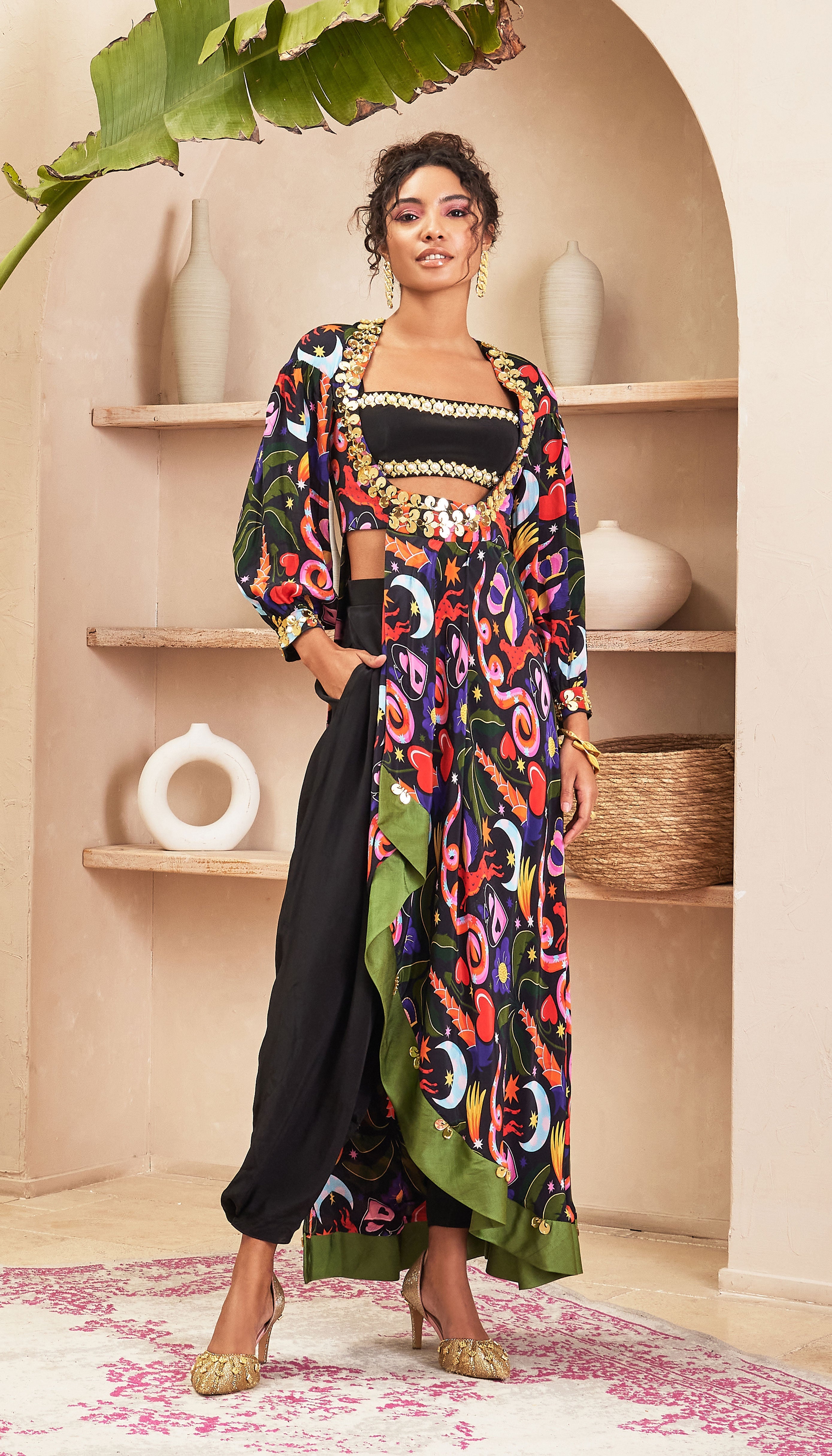 Sloane - Black Jungle Print Jacket With Dhoti Pant & Top