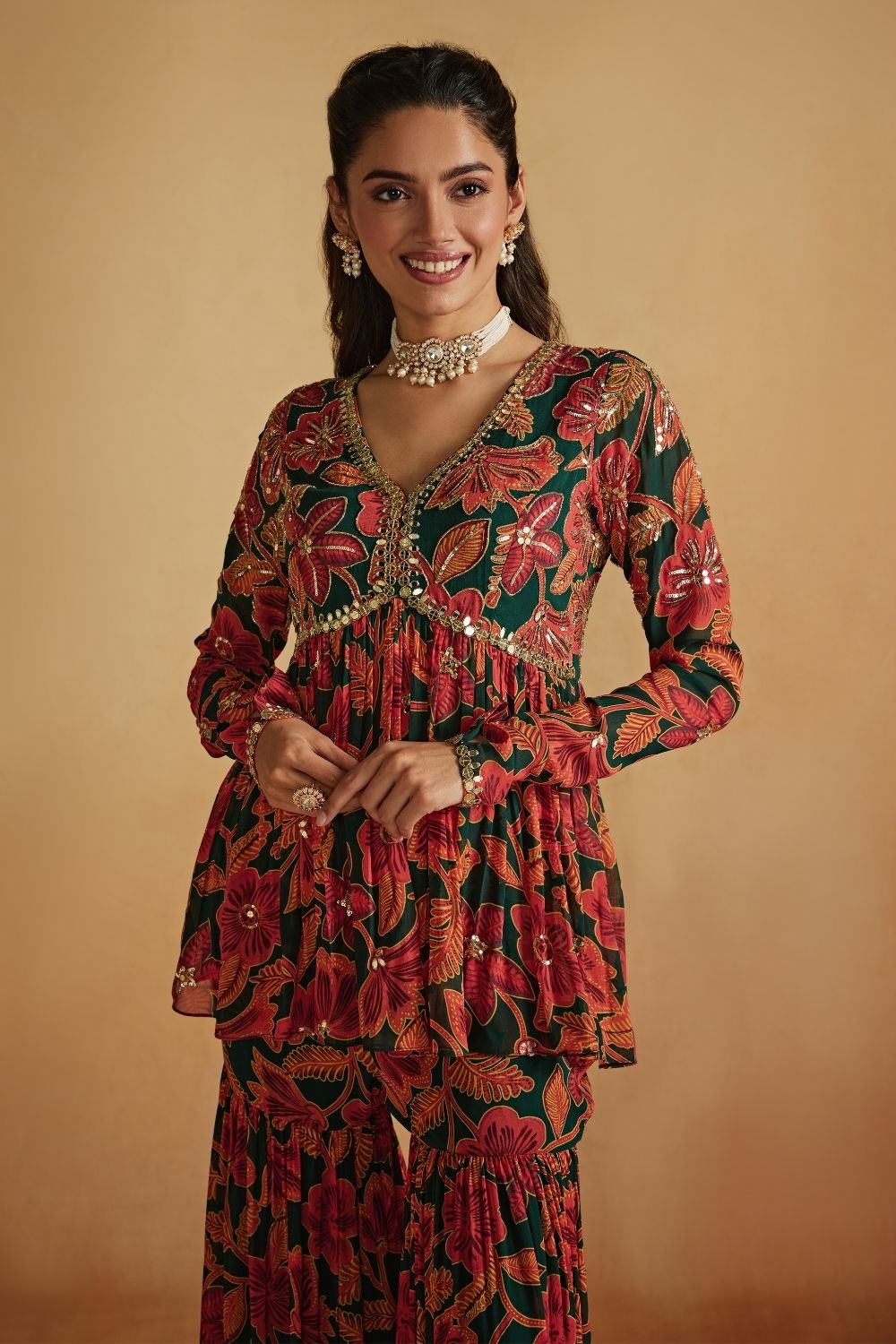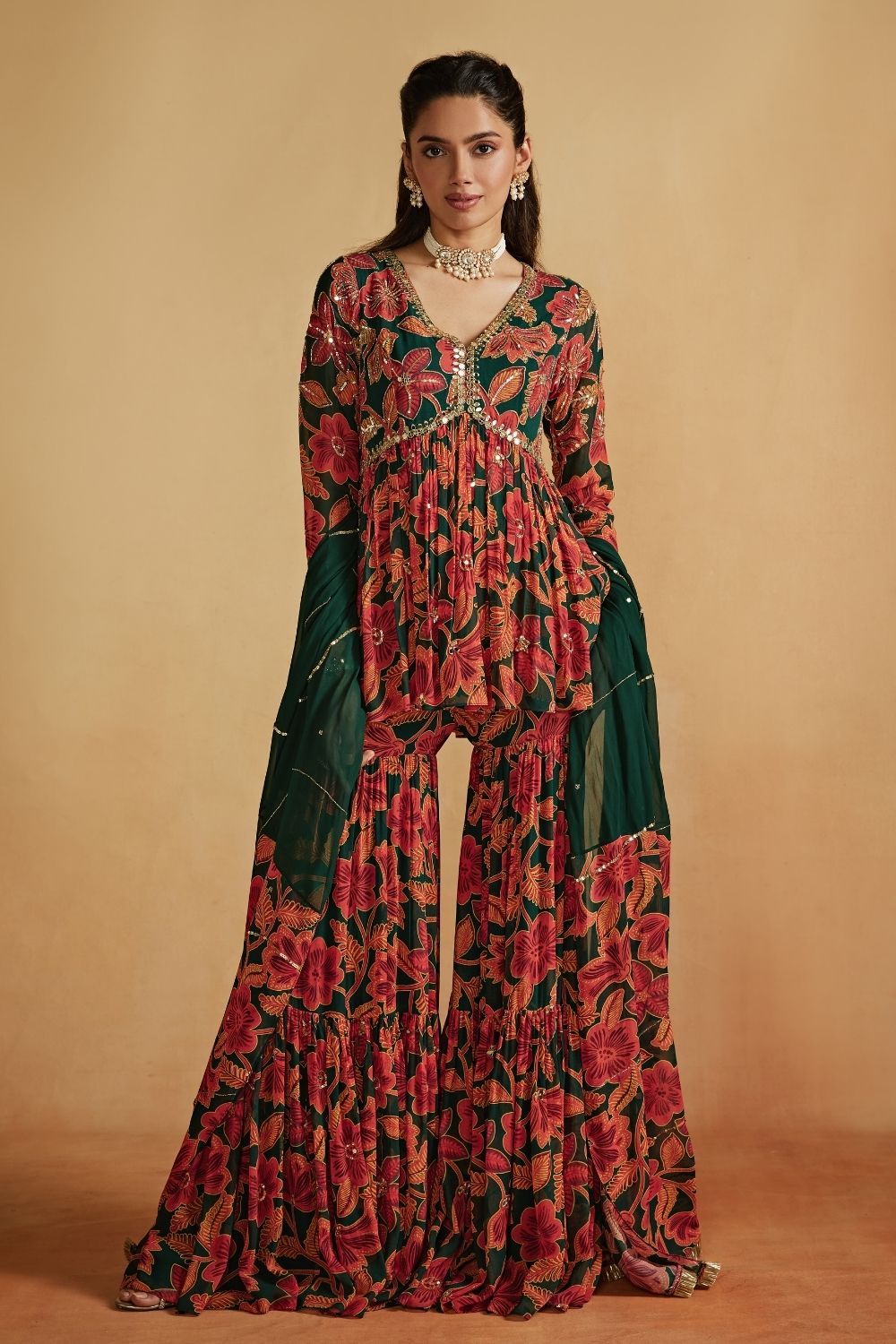 'Green Floral Printed Peplum And Sharara Set' is from Inara collection by Sanya Gulati. A chic green printed peplum in printed georgette paired with gathered a sharara, beautifully adorned with intricate cutdana embroidery and delicate highlighting. A perfect blend of elegance and statement style it is paired with a georgette half and half dupatta with cut-daana embroidery.