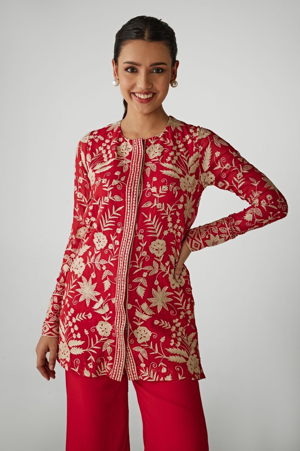 'Red Aari Work Jacket And Pants Set' is from Inara collection by Sanya Gulati. Step into effortless style with this co-ord set featuring full floral aari resham in beige color embroidery on both top and a border on the pants. The intricate craftsmanship and delicate detailing at the bottom add a touch of sophistication, making it a perfect blend of tradition and trend.