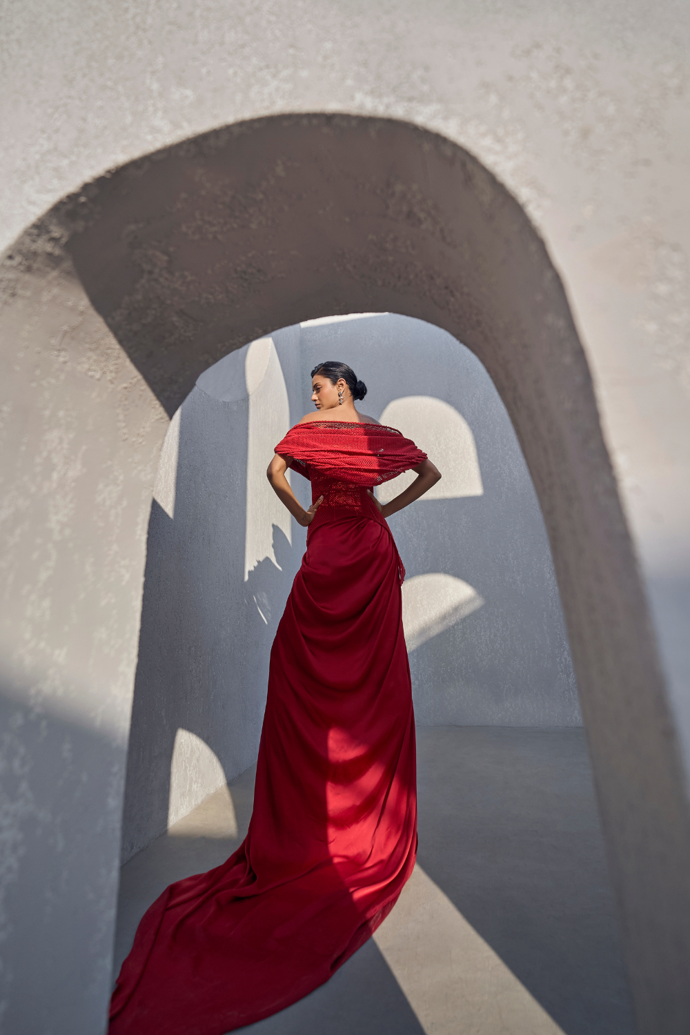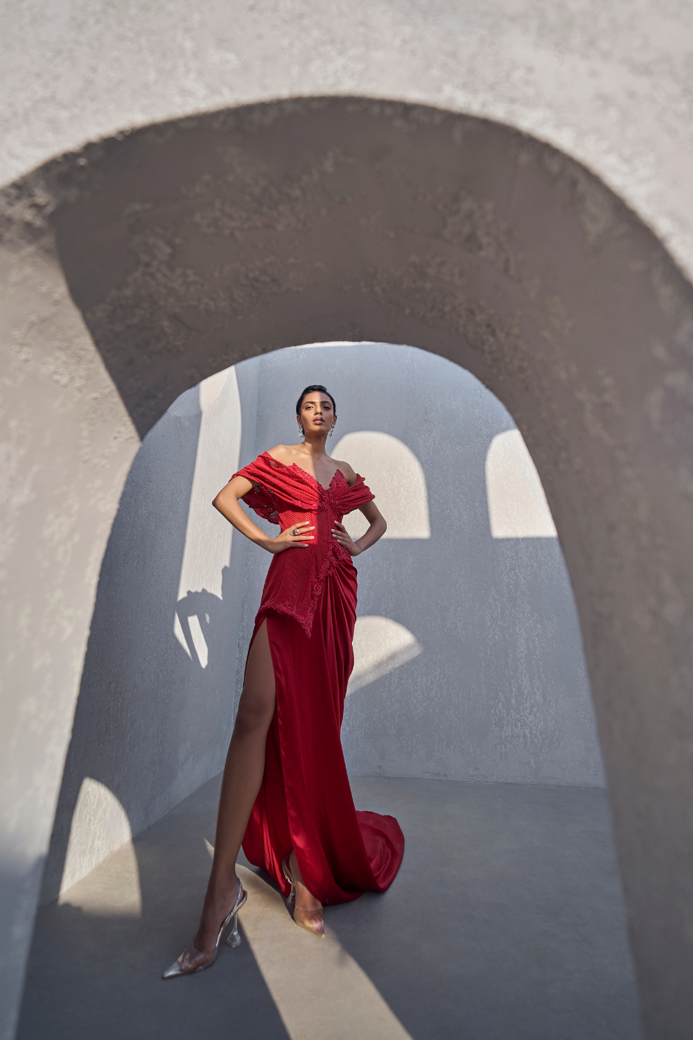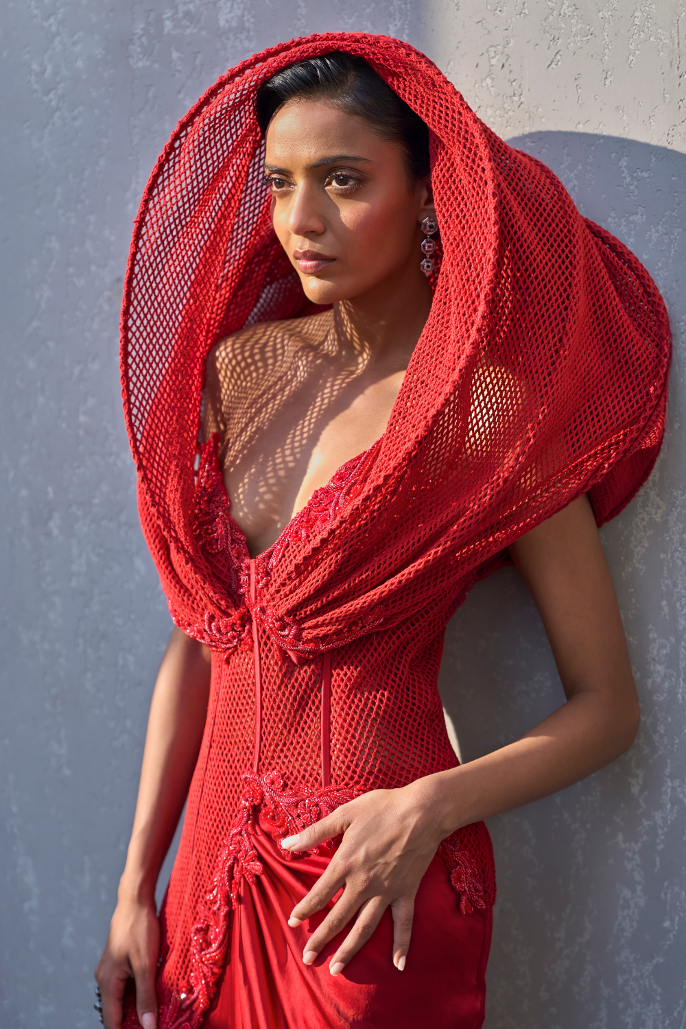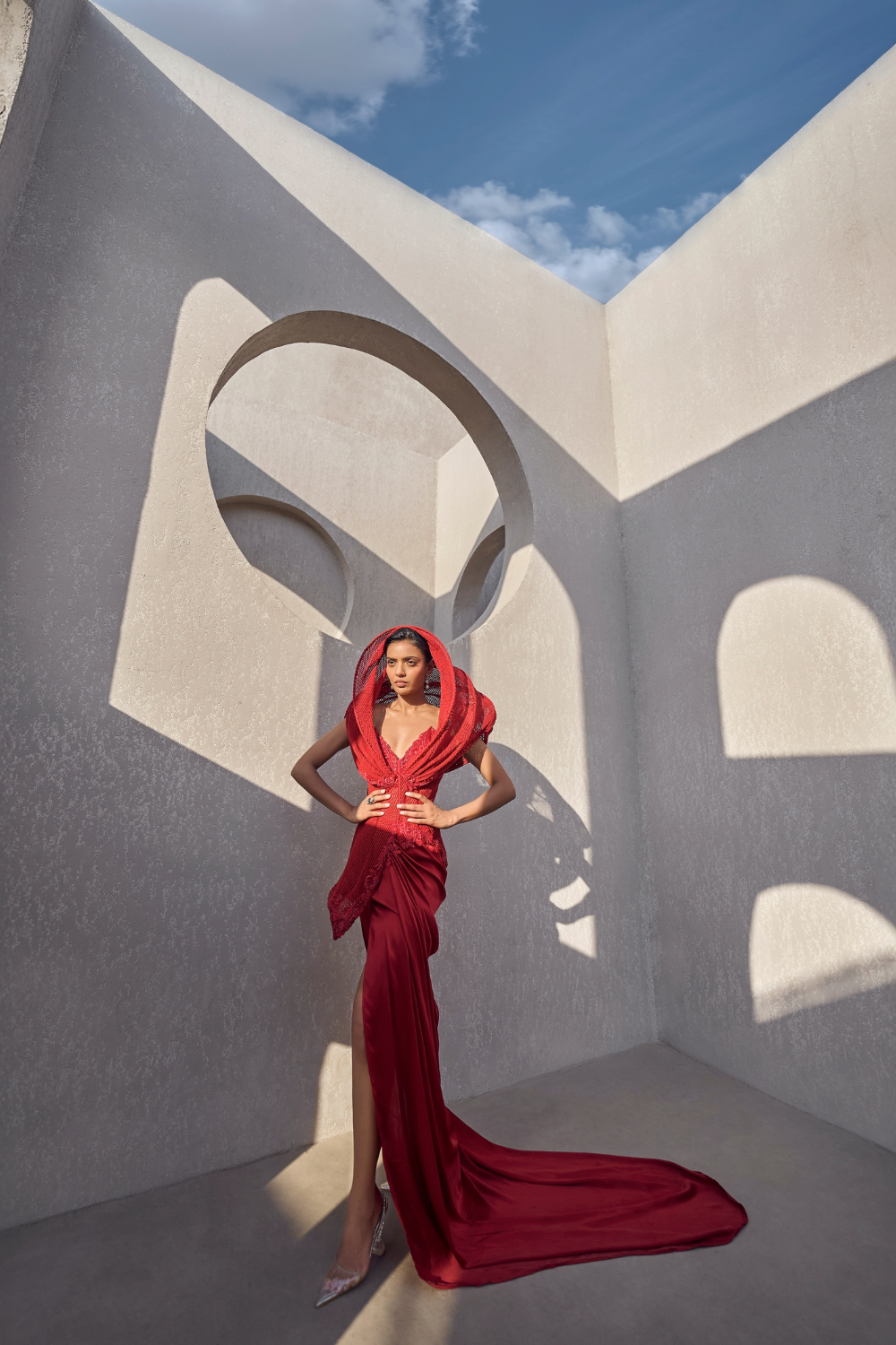 This dramatic constructed hood gown combines bold structure with intricate embroidery, creating a striking blend of modern and traditional elegance. The hood adds an edgy, contemporary touch, while the embroidered details provide a rich, luxurious finish. The gown features a daring high slit, allowing for fluid movement, and a sweeping trail that adds a sense of grandeur.