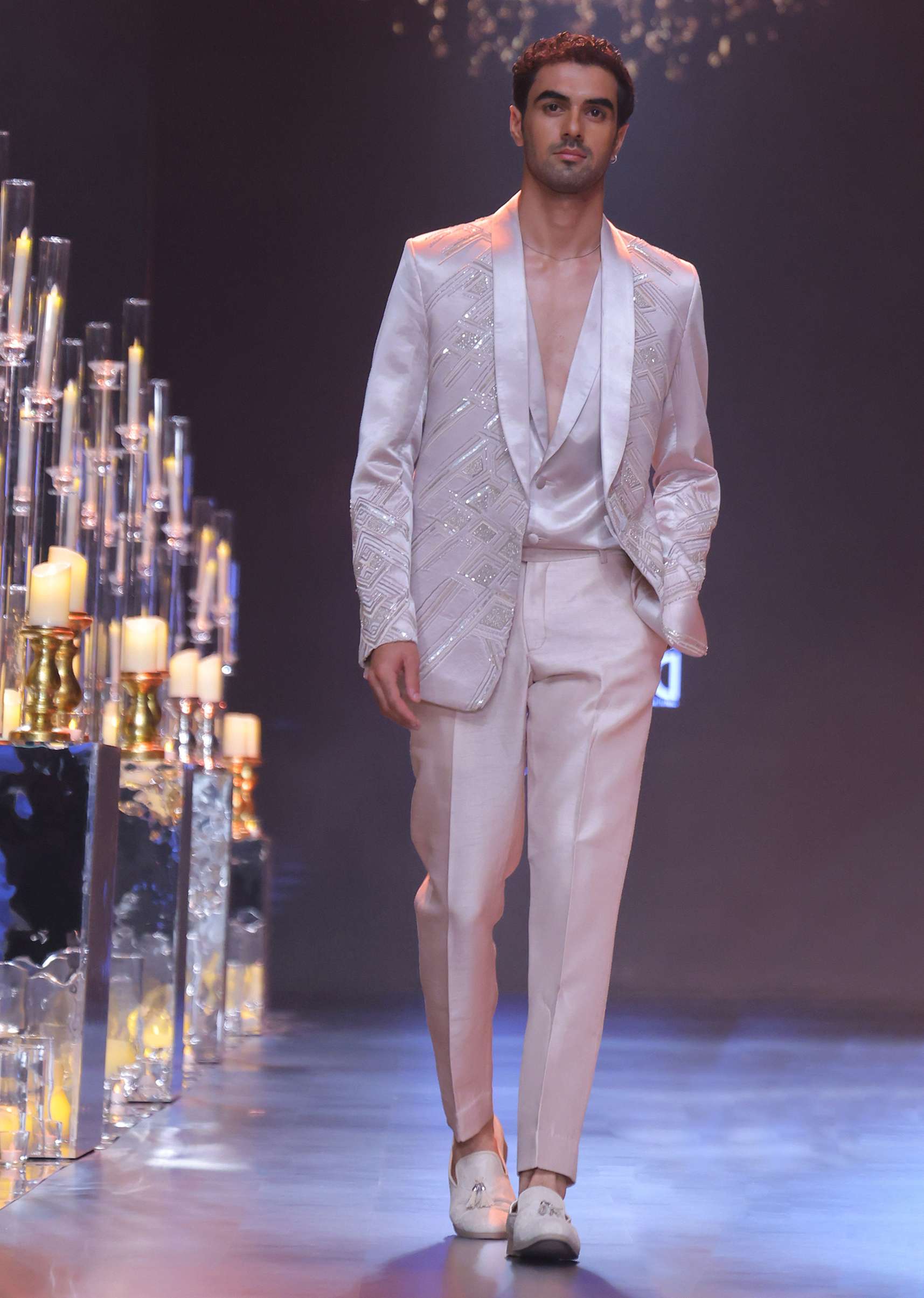 The Perfect Experimental Style To Showcase Your Individual Charm. Designed From Raw Silk And Art Silk Fabrics This Three-Piece Ensemble Is A Balance Of Modern Silhouettes And Traditional Designs. The Set Consists Of A Kurta, A Blazer And Pants.Adorned On An Earthy Beige, It Showcases A Stylish Fit. The Feel-Good Fabrics And Effortless Wear Makes This Style An Ideal Choice For Glitzy Receptions And Glamorous Sangeet Celebrations.Dry-Clean Only If Required.Slight Variation In Color Is Possible Due To Digital Photography.Being Rewarded As The Most Trusted Brand Our Customers Too Believe We Deliver The Same Styles As Promised On The Website.