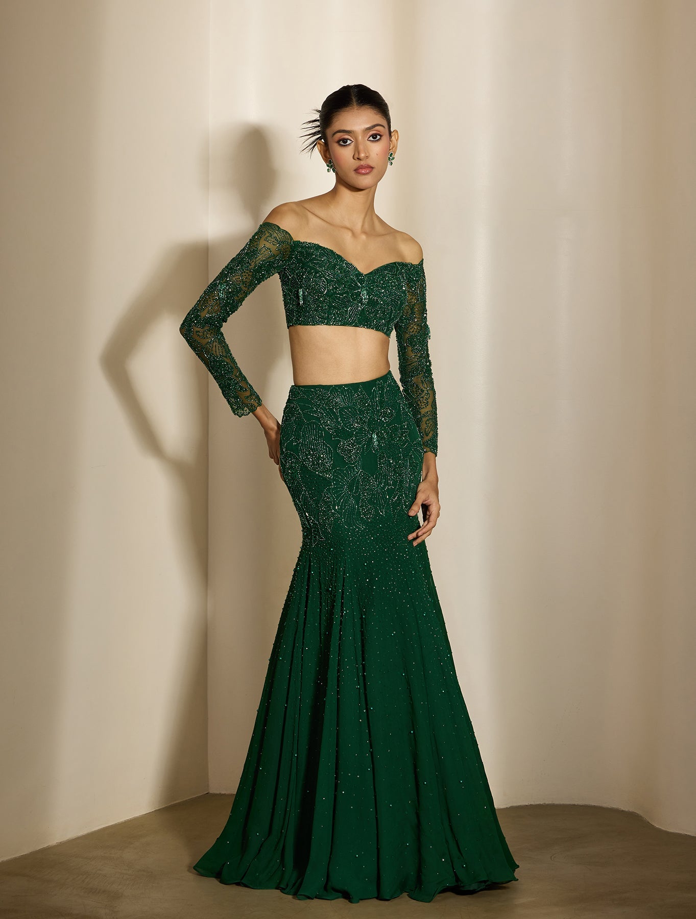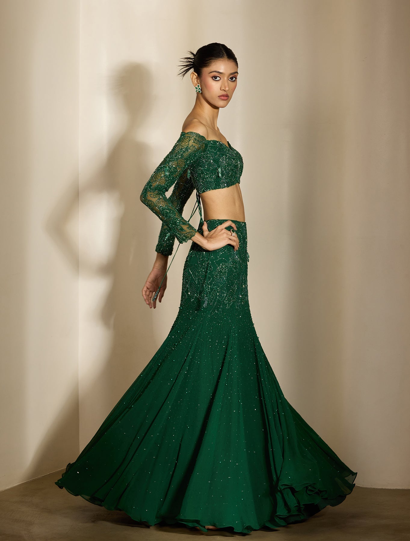 'Capri' is from Nirvana collection by Shloka Khialani. Emerald green fishtail sari paired with a concept corset blouse with full sleeves & tie back - with placement tonal fan flower hand embroidery.