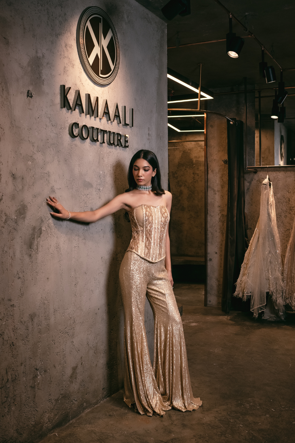 'Celi' is from Sharara collection by Kamaali Couture. Product Description: Champagne gold cutwork corset with sharara