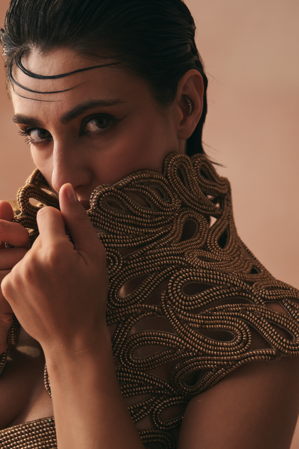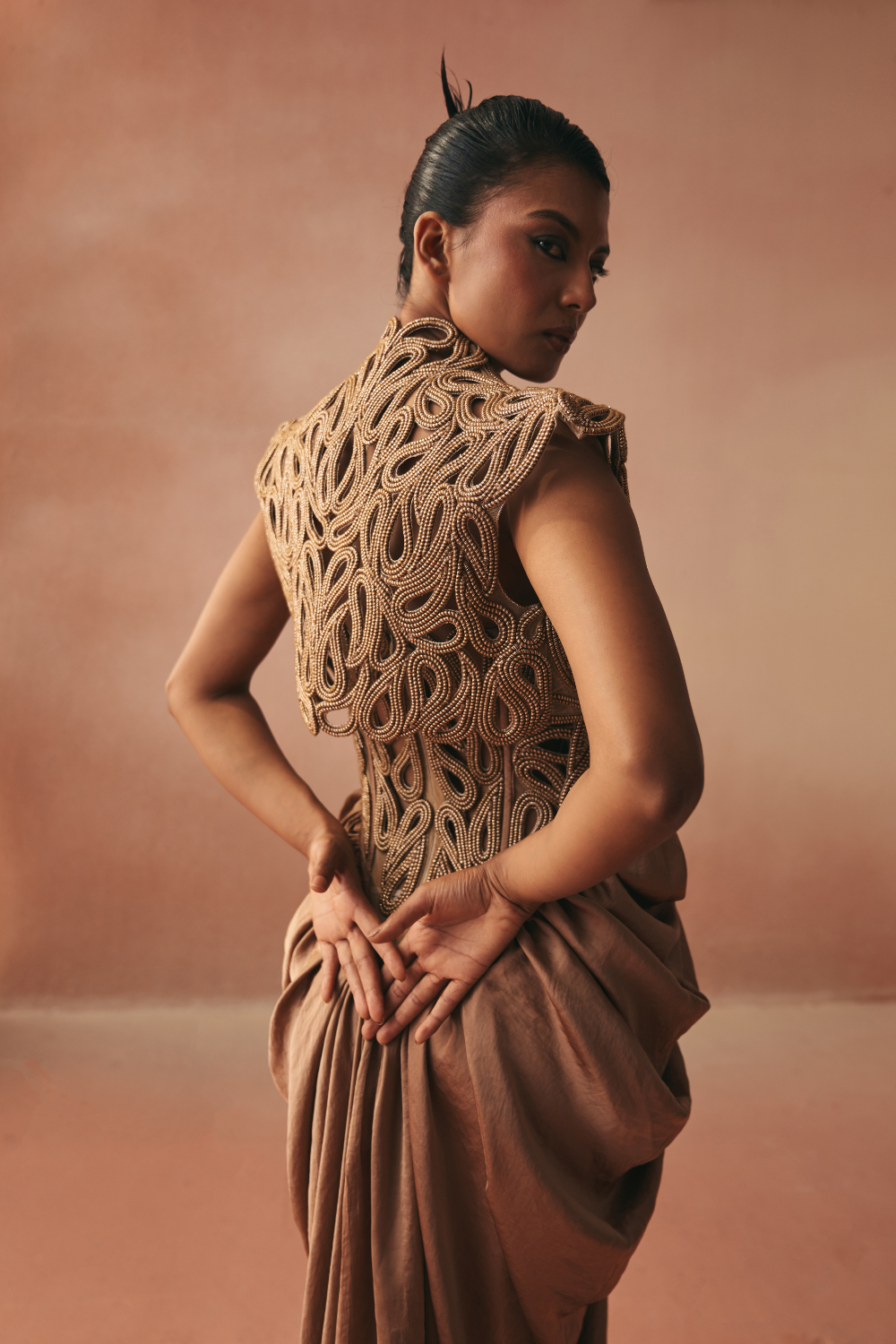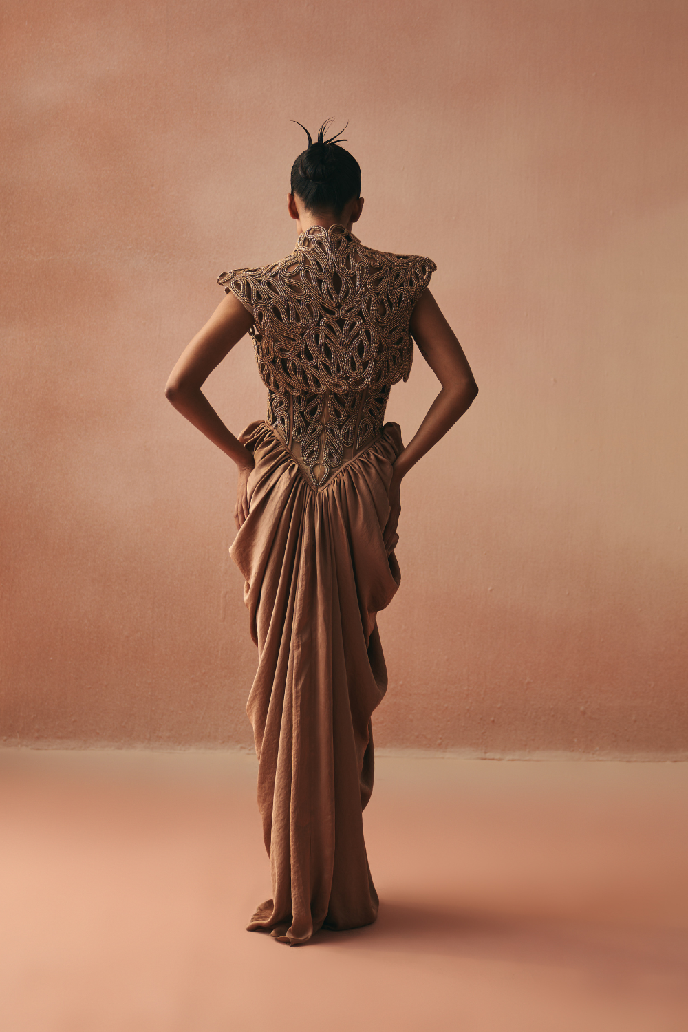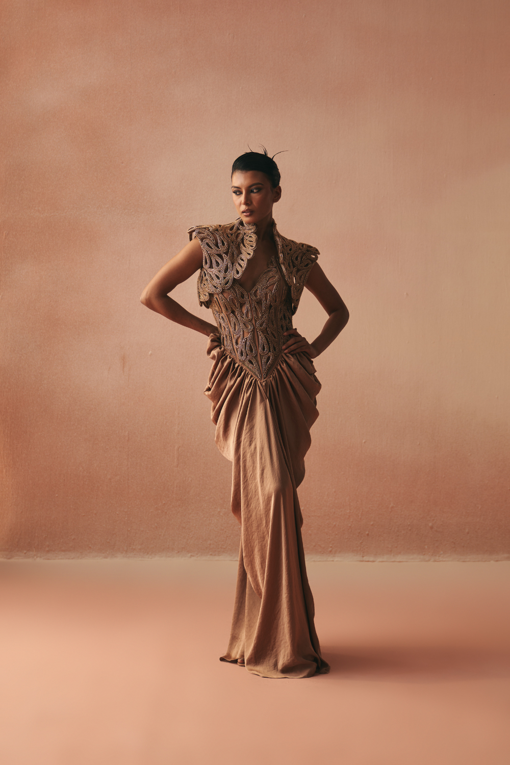 'Chaver' is from Gown collection by Kamaali Couture. A showstopper look with 3d handcrafted sculpted corset created out of cording technique with a pleated cowl bottom to complete the gown . Its further accentuated with a short standing collar jacket made of 3d cording .