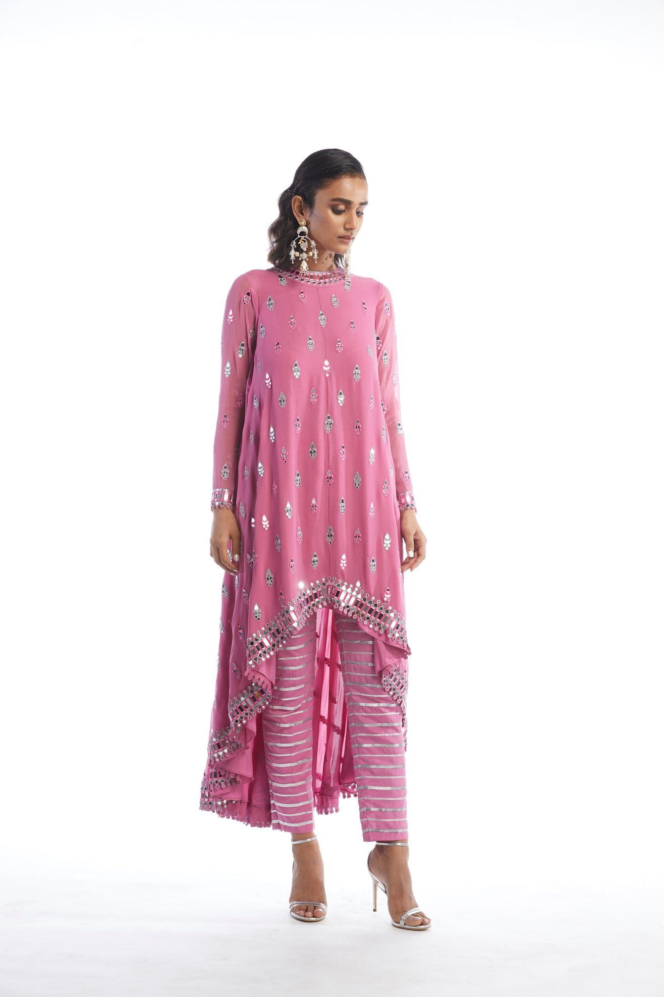 Beautifully Hand Embroidered Mirror Booties And Border Georgette Kurta Paired With Silver Gota Pants. Fabric Used : Kurta - Georgette Dhoti- Crepe Inner- Crepe Components : Kurta Dhoti Inner Colour : Dark Blush Embroidery Colour : Silver Beautifully Hand Embroidered Mirror Booties And Border Georgette Kurta Paired With Silver Gota Pants. Fabric Used : Kurta - Georgette Dhoti- Crepe Inner- Crepe Components : Kurta Dhoti Inner Colour : Dark Blush Embroidery Colour : Silver