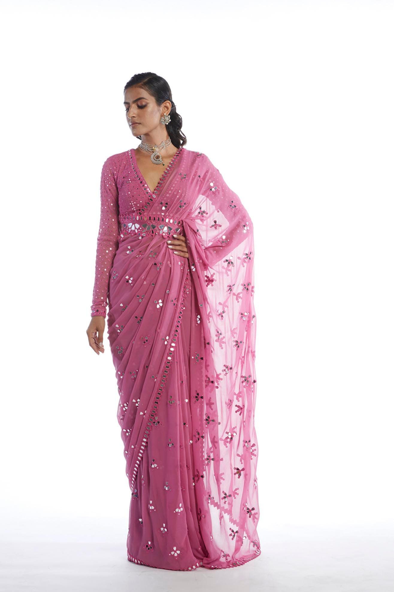 All Over Hand Embellished Mirror Cut-Work Boota Saree Paired With Mirror Cut Work Belt And V-Neck Full Sleeves And Embroidered Blouse. Fabric Used Saree - Georgette Blouse - Georgette Components Blouse Saree Belt Colour Dark Blush Embroidery Colour Silver