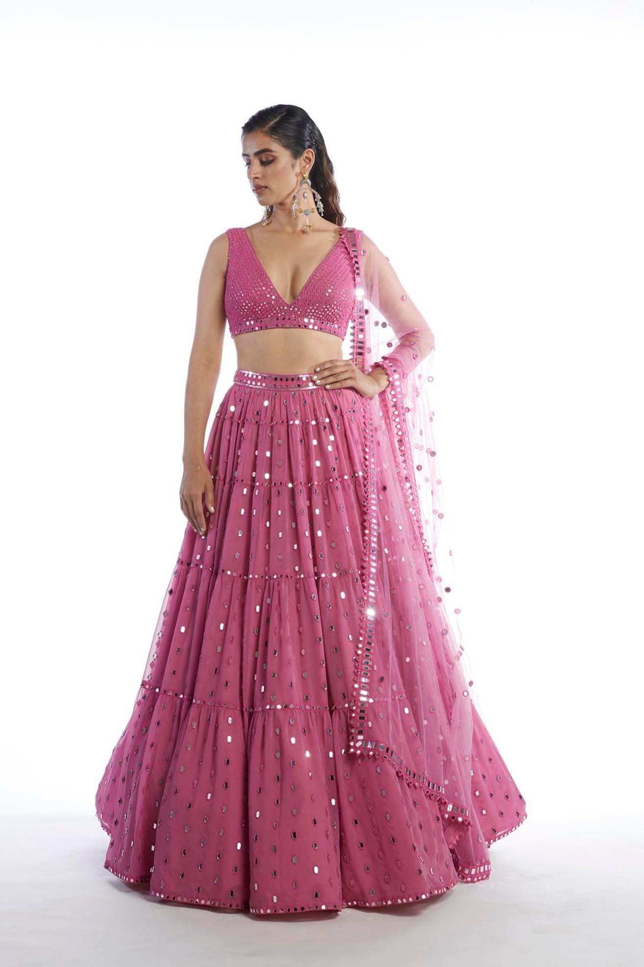 Intricately Hand Embroidered Gradation Mirror Skirt Paired With Sweet-Heart Neck Blouse And Net Mirror Dupatta. Fabric Used Lehenga - Georgette Dupatta - Net Blouse - Georgette Lining - Silk Blend Components Blouse Lehenga Dupatta Colour Dark Blush Embroidery Silver Intricately Hand Embroidered Gradation Mirror Skirt Paired With Sweet-Heart Neck Blouse And Net Mirror Dupatta. Fabric Used Lehenga - Georgette Dupatta - Net Blouse - Georgette Lining - Silk Blend Components Blouse Lehenga Dupatta Colour Dark Blush Embroidery Silver