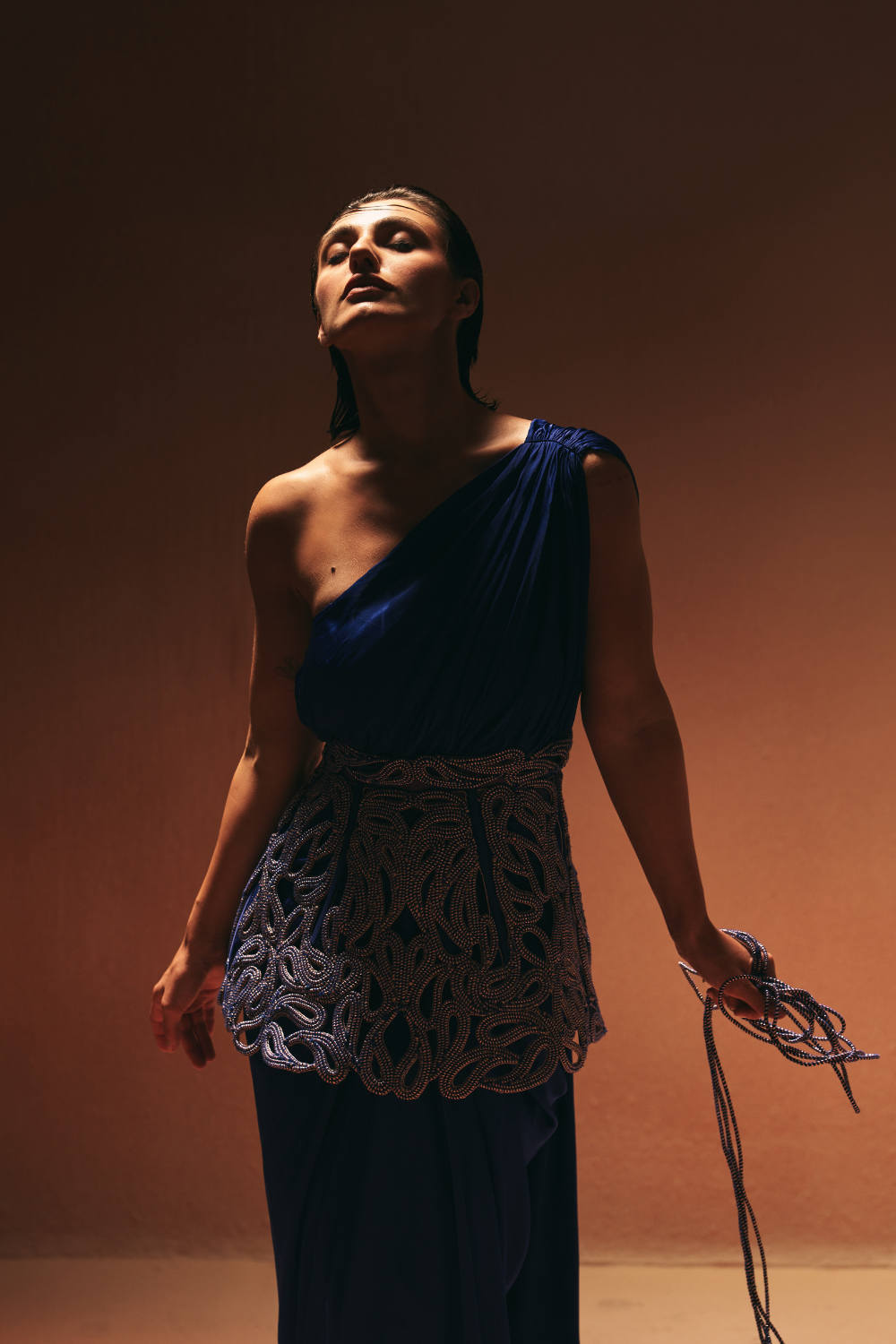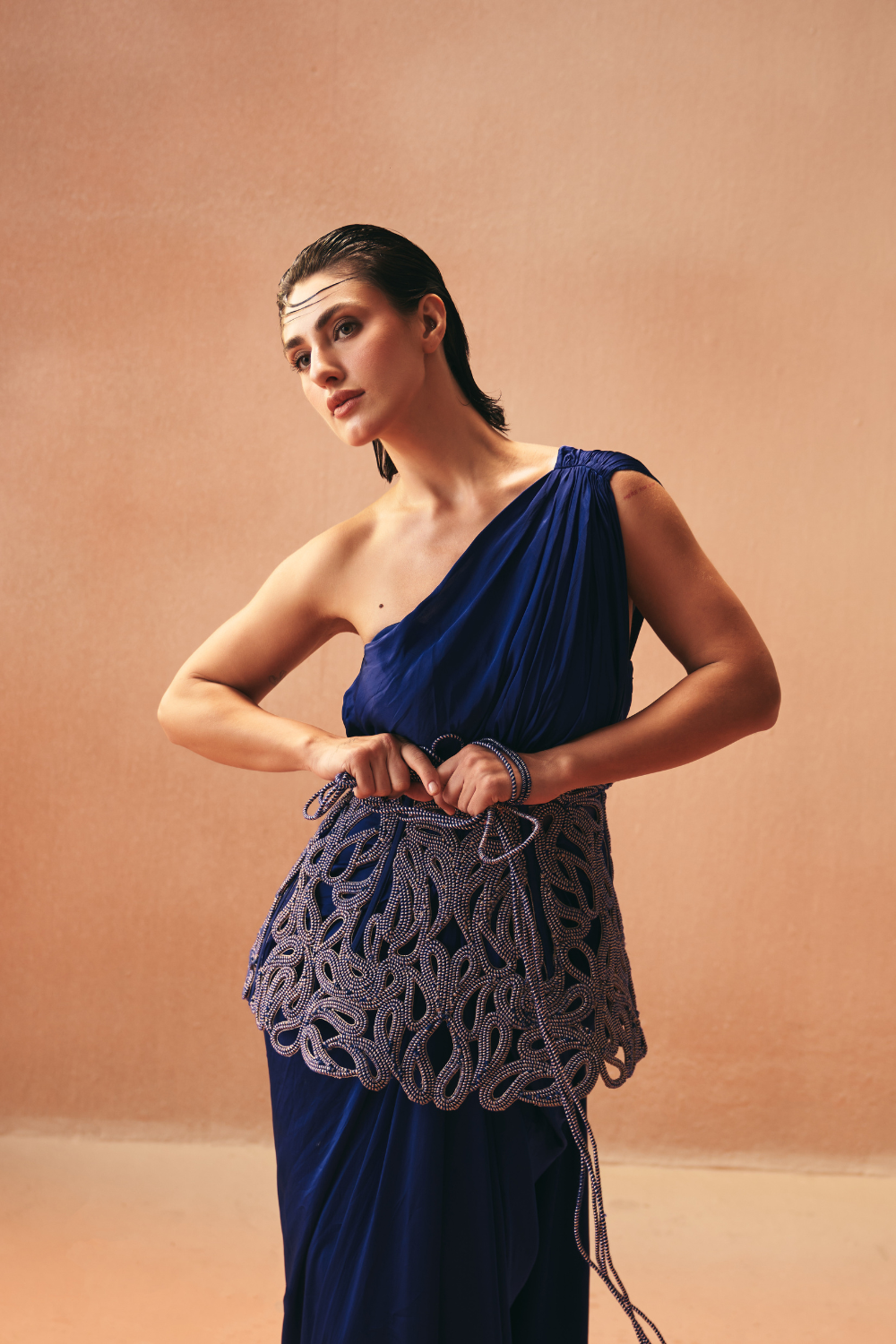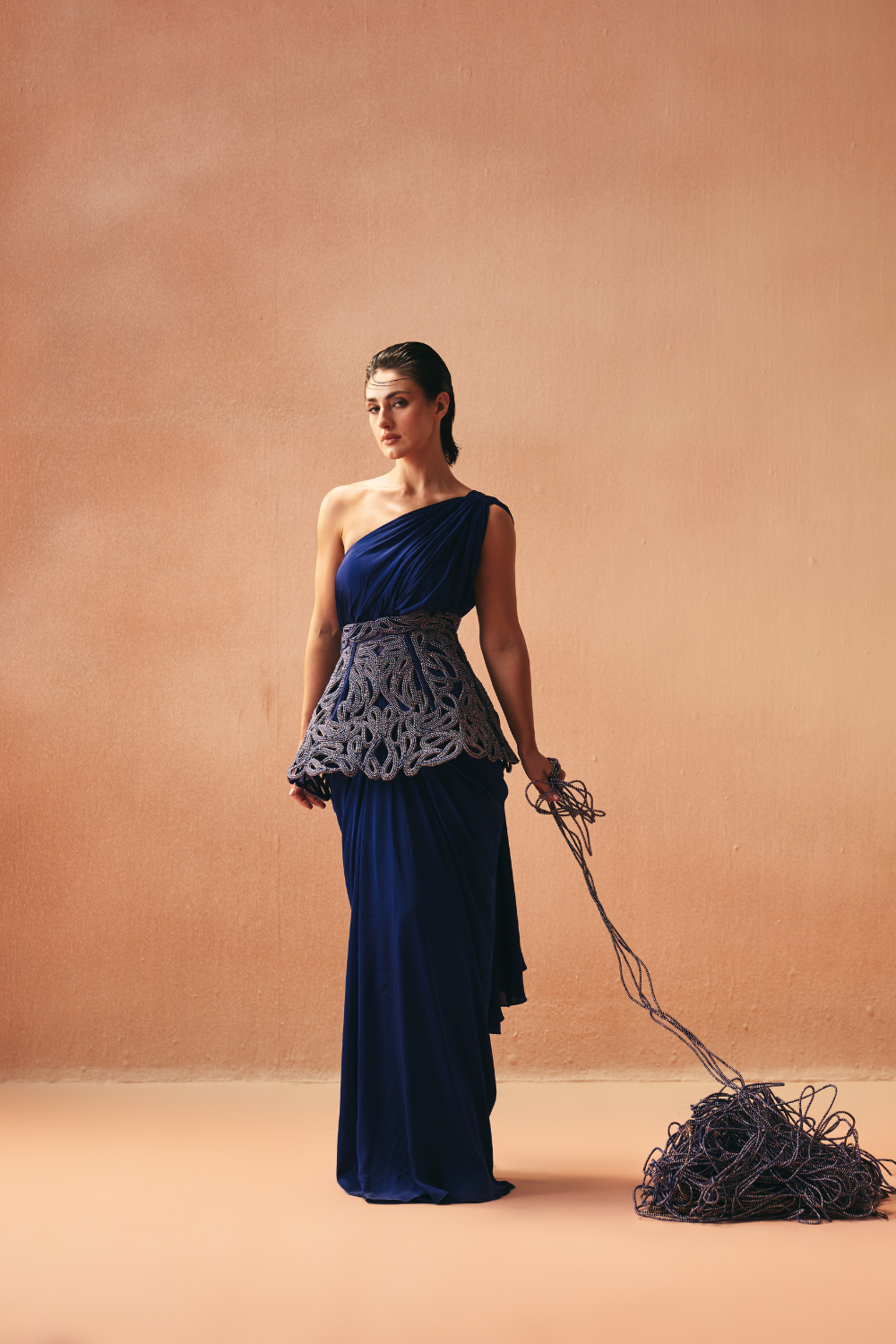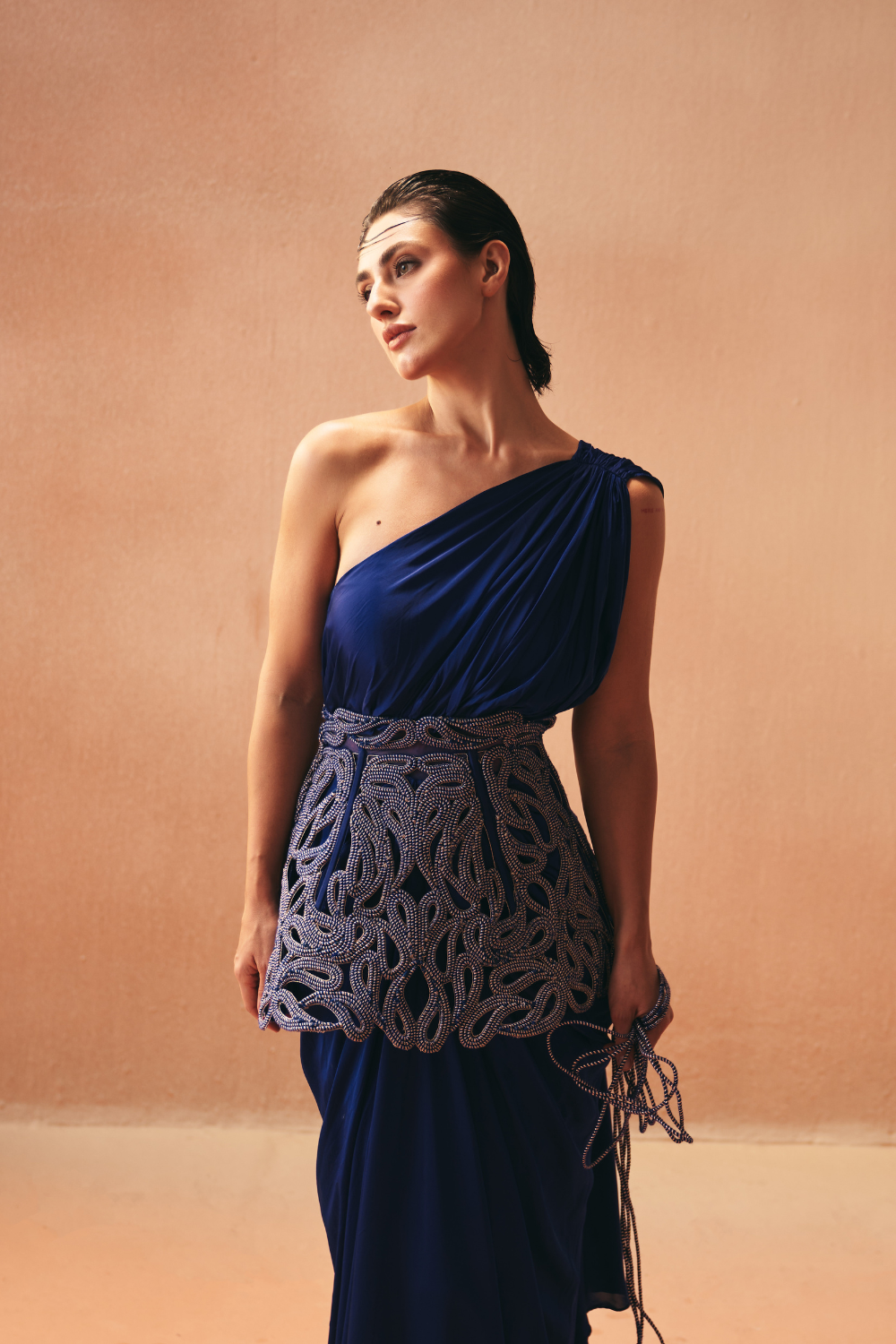 'Lazo' is from Gown collection by Kamaali Couture. One shoulder sari gown look accessorised with a standing high waist constructed belt in paisely motif .