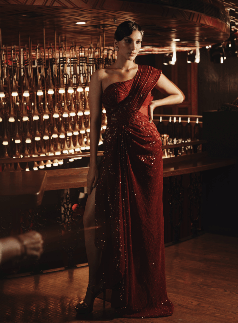 'One Shoulder Slit Gown' is from Gown collection by Kamaali Couture. Product Description: Machine embroidered Sequin Crushed slit Gown