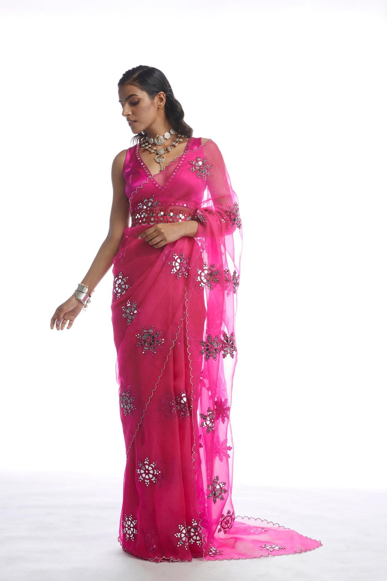 All Over Round Mirror Cut-Work Silk Organza Saree With V Neck Satin Blouse And Mirror Cut-Work Belt. Fabric Used Saree - Organza Blouse - Satin Components Blouse Saree Belt Colour Peacock Pink Embroidery Colour Silver