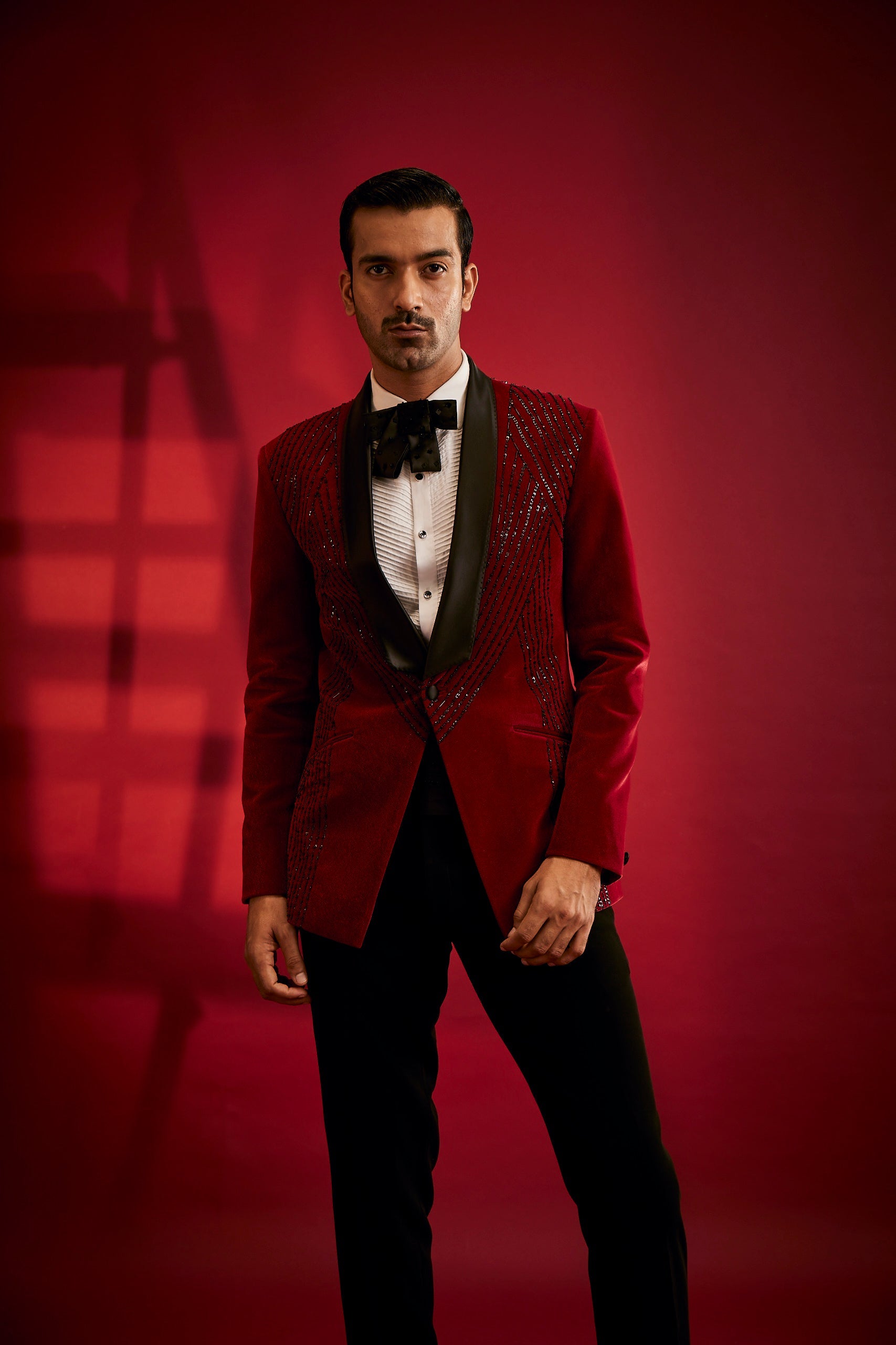 Featuring Red Velvet Tuxedo Highlighted With Black Sequin And Pearl Work Paired With White Shirt, Bow, Waist-Belt And Pants