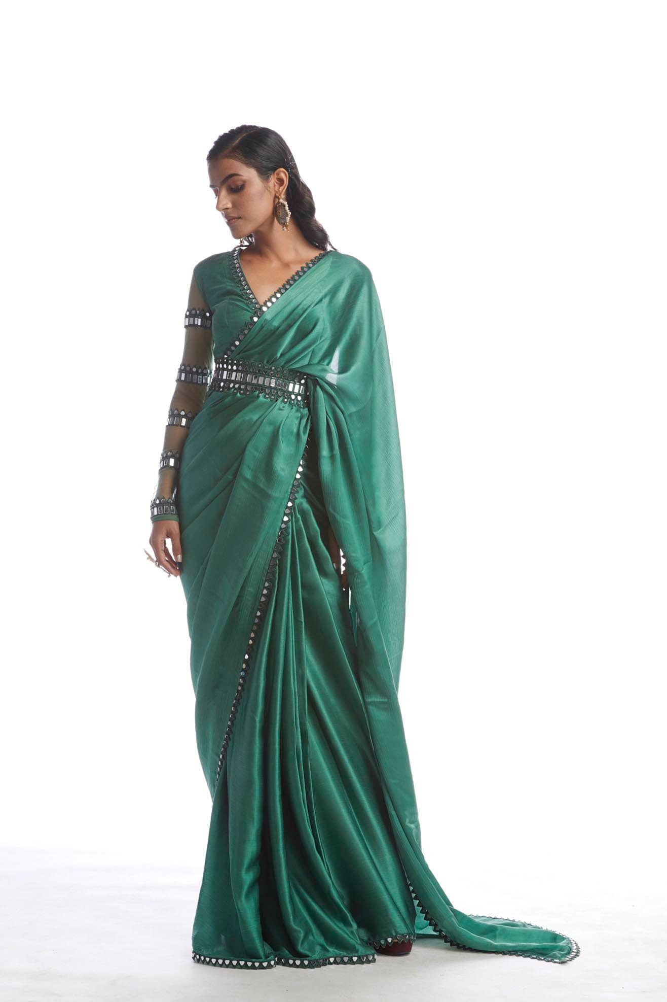 Satin Chiffon Satin Chiffon Saree Paired Paired With Chiffon Saree Paired With Mirror Cut Work Belt And Mirror Embellished Round Neck Net Blouse. Fabric Used : Saree - Satin Chiffon Blouse - Net Components : Blouse Saree Belt Colour : Sage Green Embroidery Colour : Silver