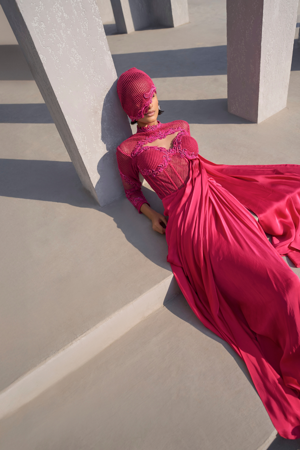 This gown features a constructed bodice that provides a structured, flattering fit, while the embroidered body adds intricate, luxurious detail. The attached drape flows elegantly, creating a graceful silhouette, and the bottom completes the look with soft, fluid movement.