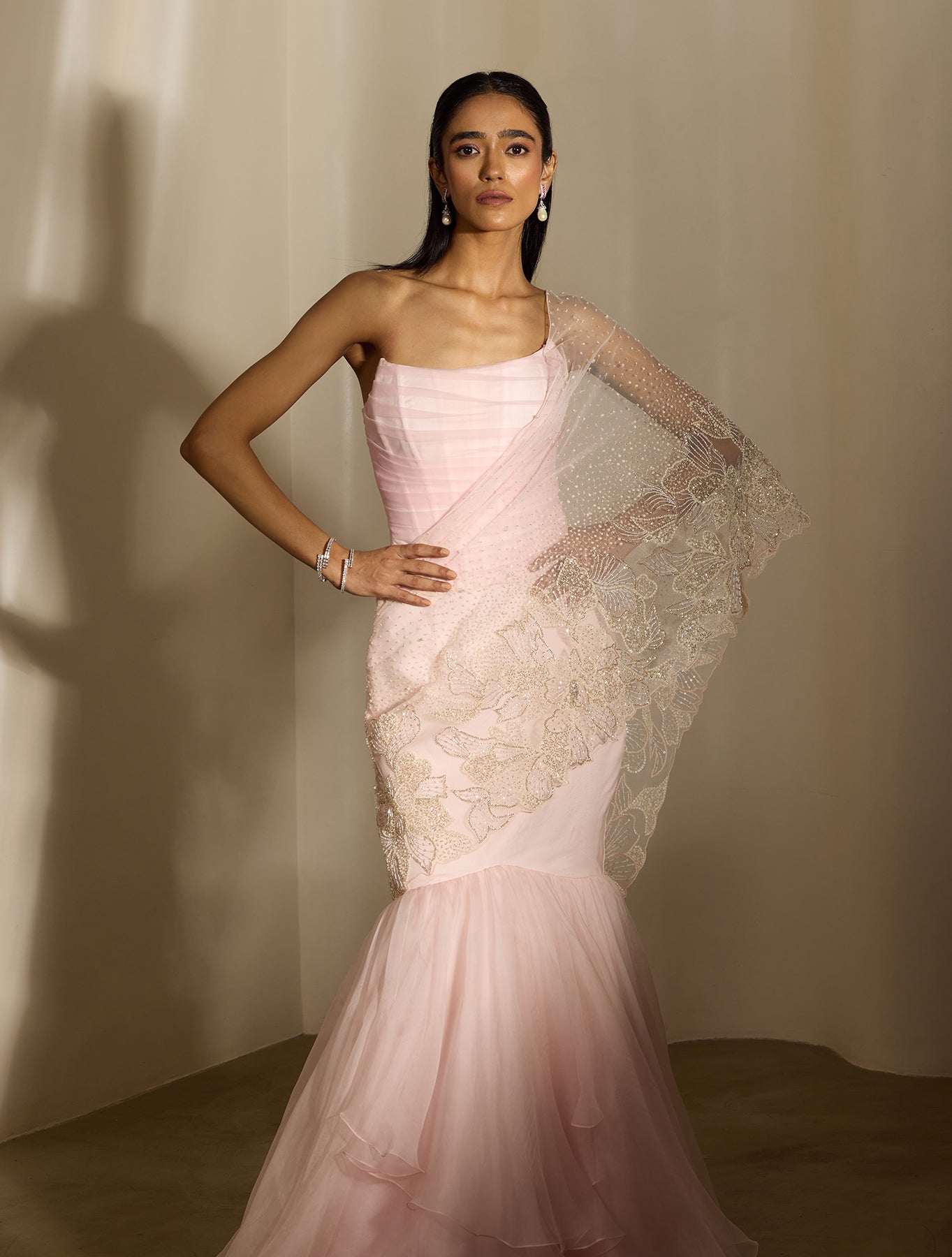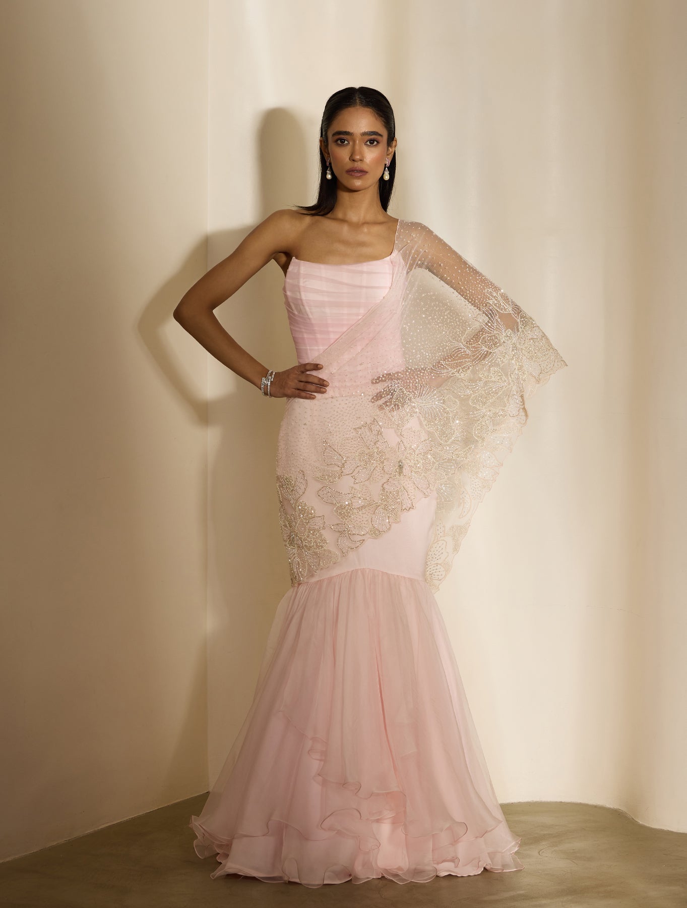 'Viona' is from Nirvana collection by Shloka Khialani. Baby pink organza layered lehenga featuring and attached net open drape hand embellished with silver and ivory abstract florals. Paired with a draped net corset top.