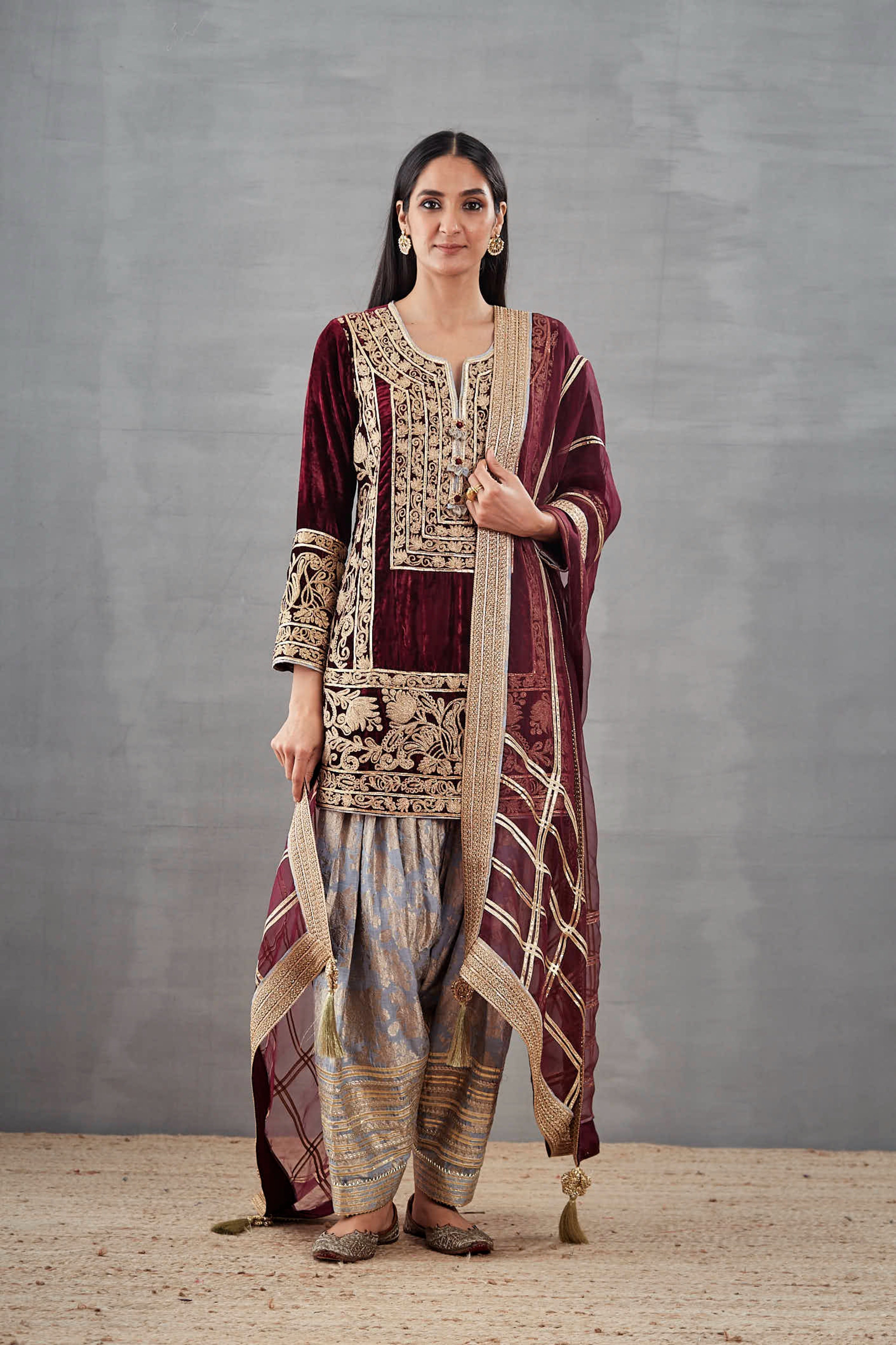 Product Description A Velvet Short A-Line Kurta embroidered with Zari and Dori Work all over is paired with a Contrast Banarsi Salwar and Organza Dupatta accented with Gota work on it. Composition & Care Velvet, Banarsi Organza, Muslin Lining Dry clean only Number of Components 3 Delivery Timeline 30 Days