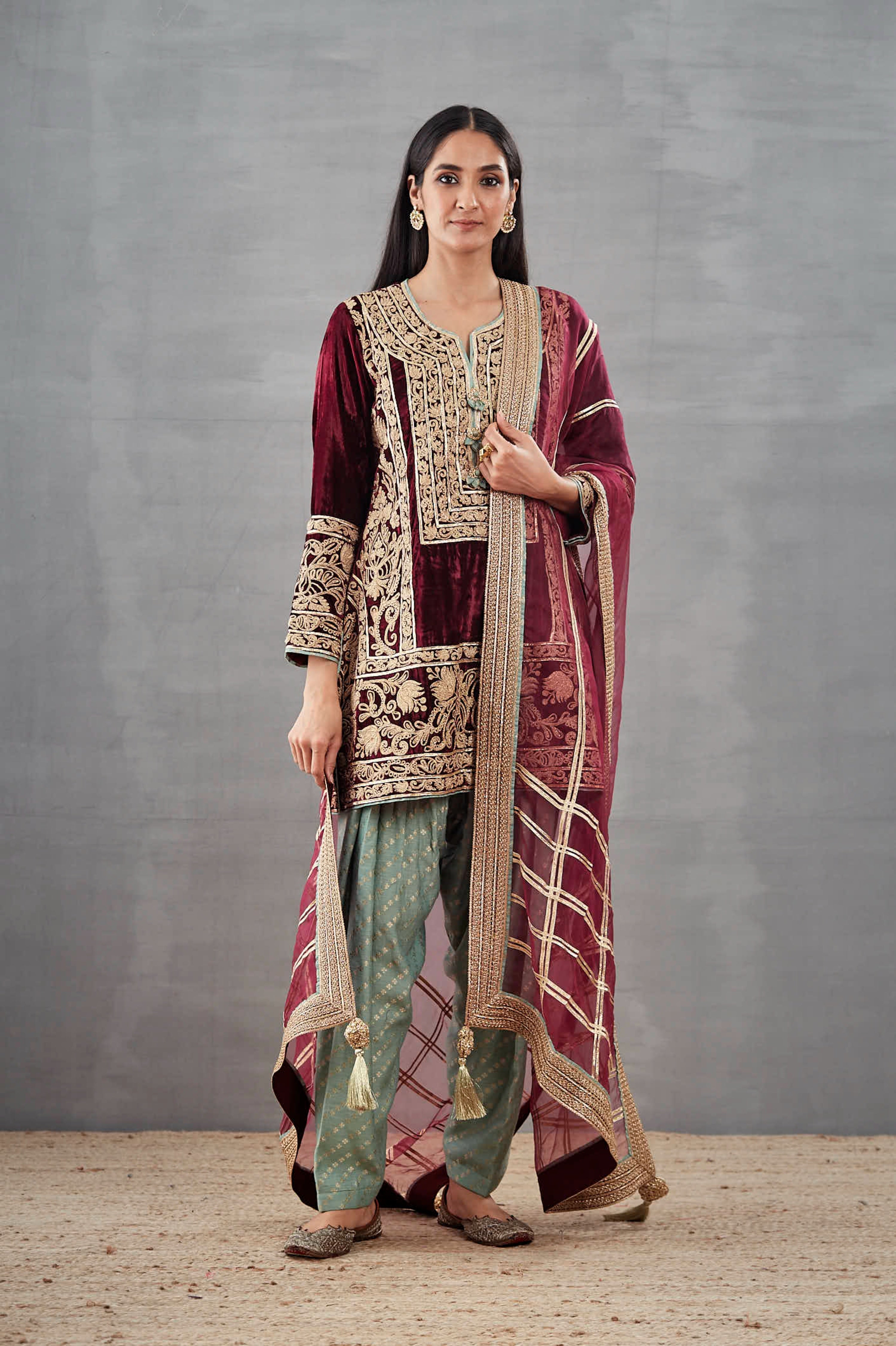 Product Description A Velvet Short A-Line Kurta embroidered with Zari and Dori Work all over is paired with a Contrast Banarsi Salwar and Organza Dupatta accented with Gota work on it. Composition & Care Velvet, Banarsi Organza, Muslin Lining Dry clean only Number of Components 3 Delivery Timeline 30 Days