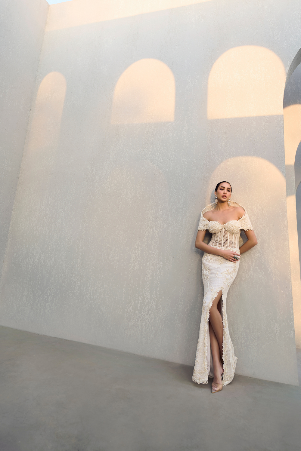 'Bianca' is from Gown collection by Kamaali Couture. This high slit gown features an off-shoulder neckline and a striking standing back detail. The fitted bodice flows into a sleek skirt with a daring thigh-high slit, combining elegance and boldness for a stunning, sophisticated look.