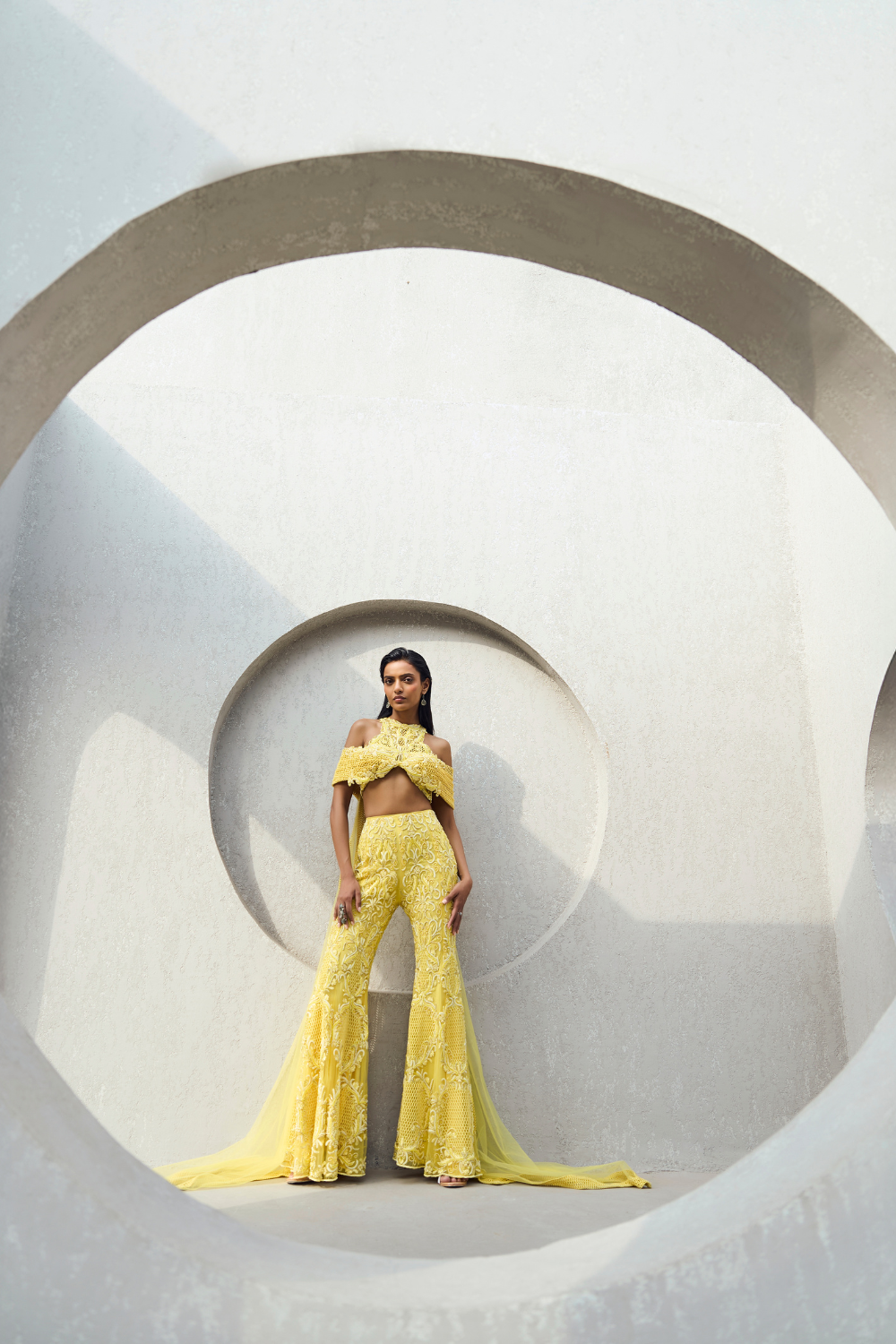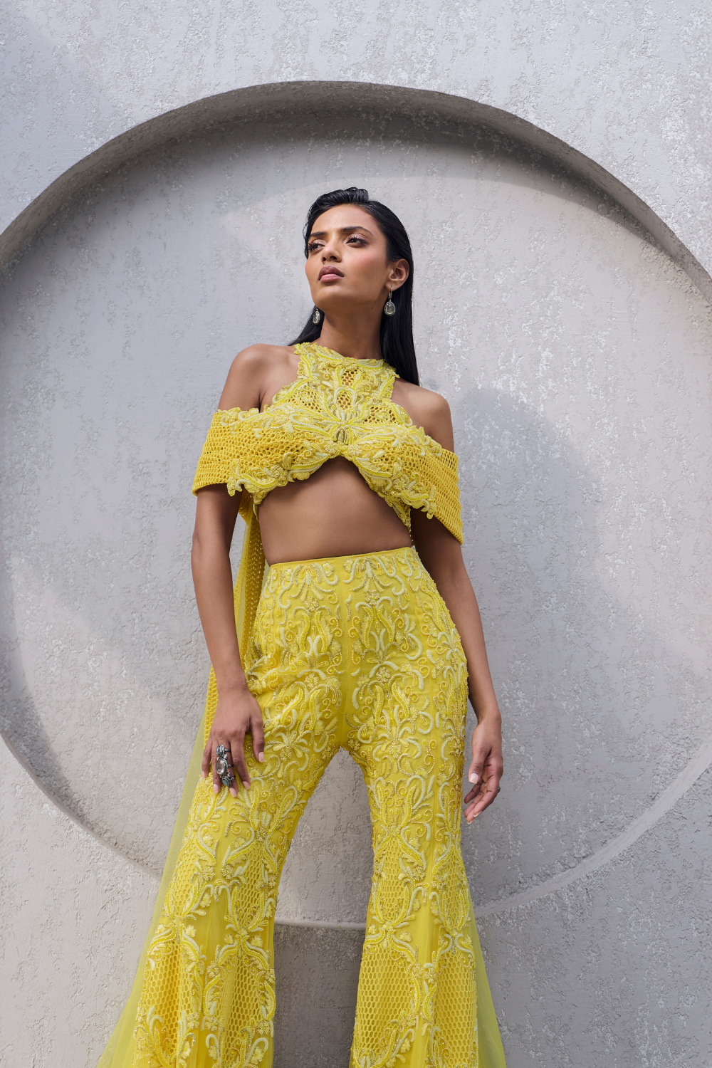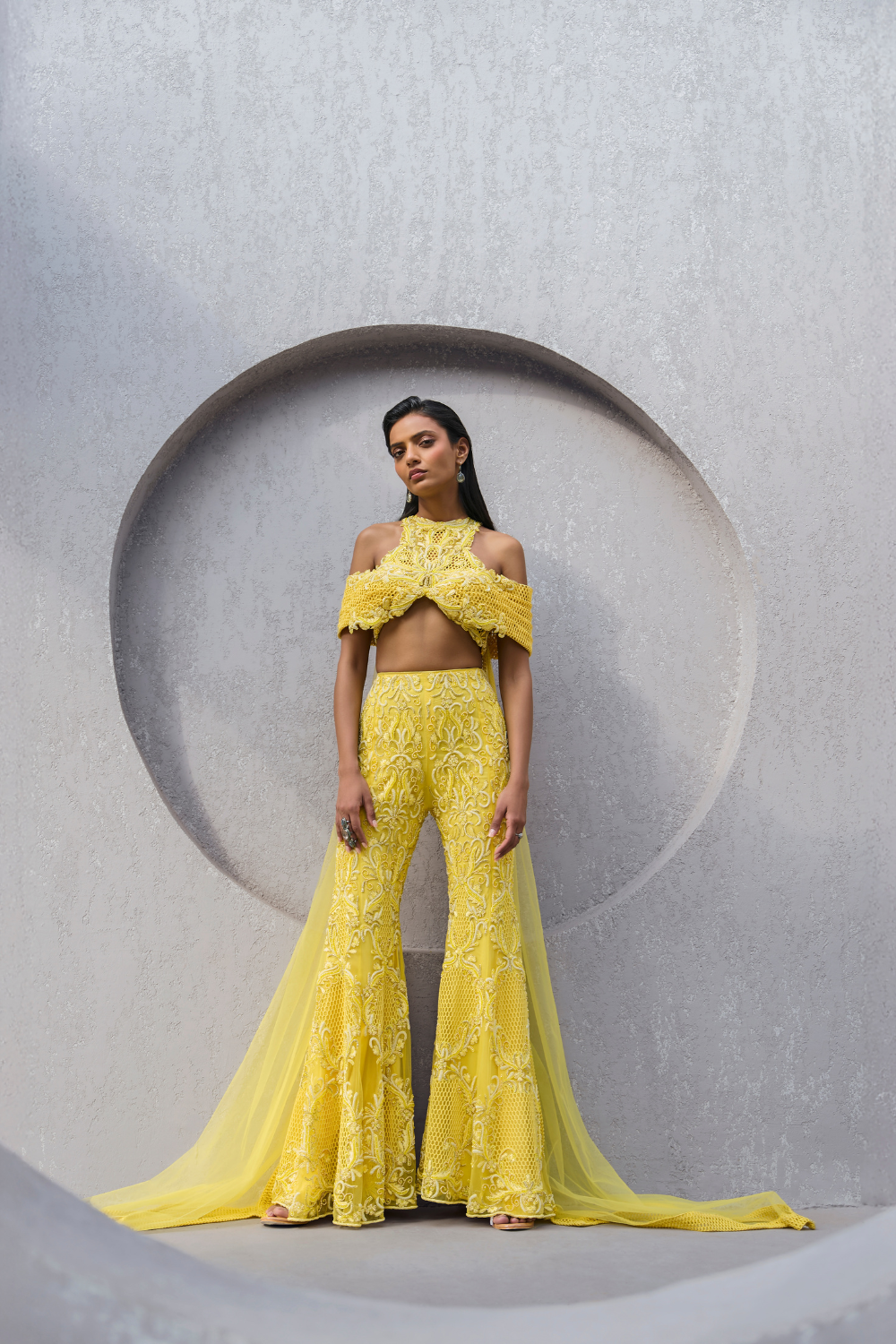Vibrant yellow blouse features a tailored construction and attached tulle drape paired with an embroidered sharara showcasing intricate floral details, blending modern style with traditional elegance.