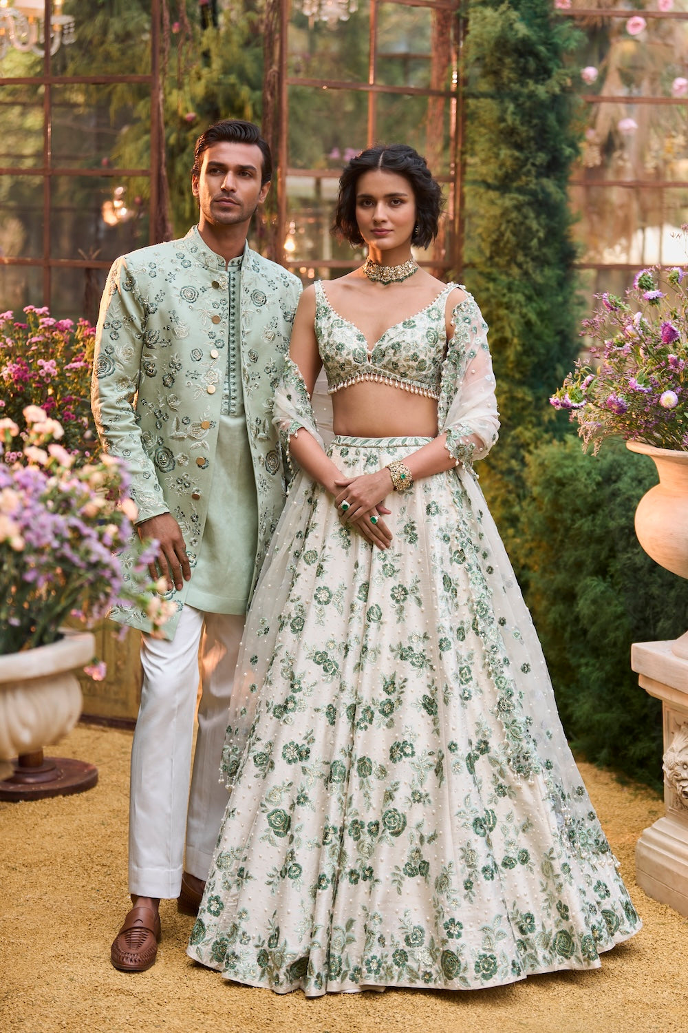 'Emerald Floral Lehenga Set' is from Eden collection by Seema Gujral. This lehanga set features tones of emerald floral silk thread embroidery and delicate pearl accents paired with a sleeveless embroidered blouse adorned with tassels on the waist area. The scalloped embroidered organza dupatta gives a breezy summer statement adorned with pearl tassels all over.