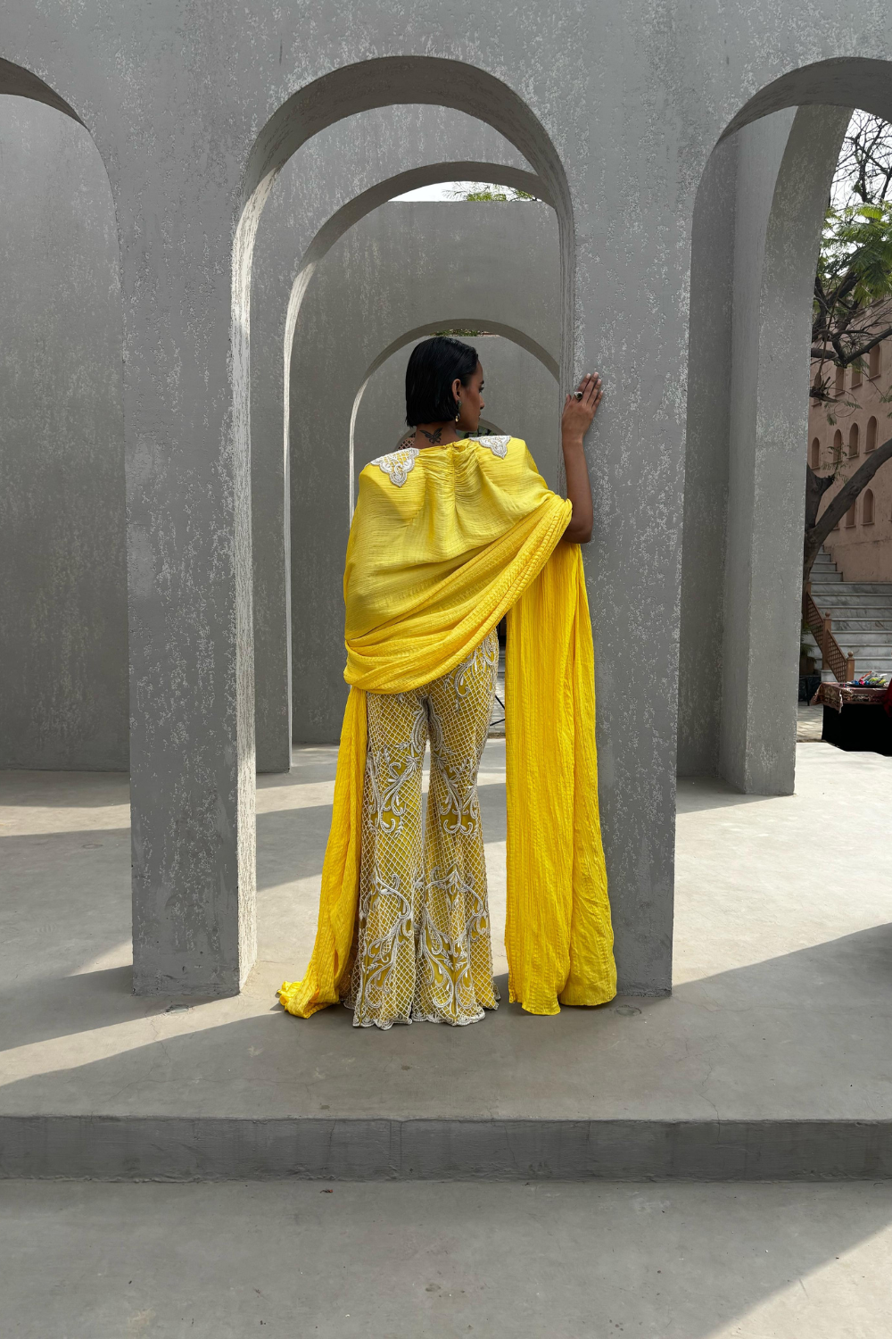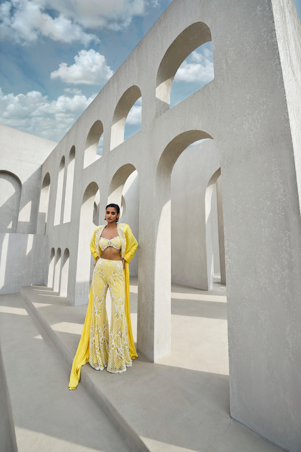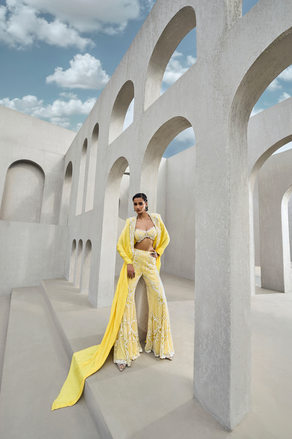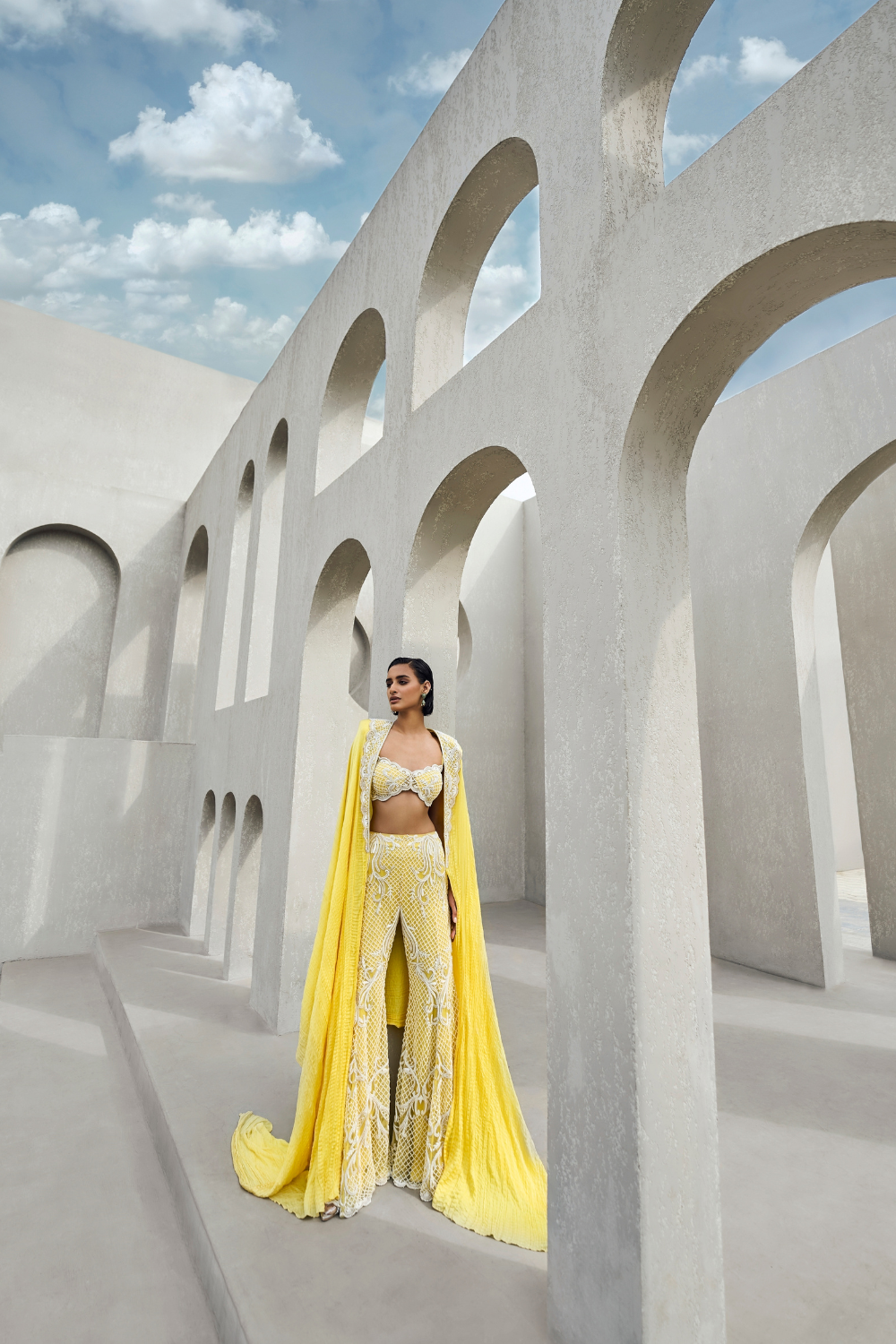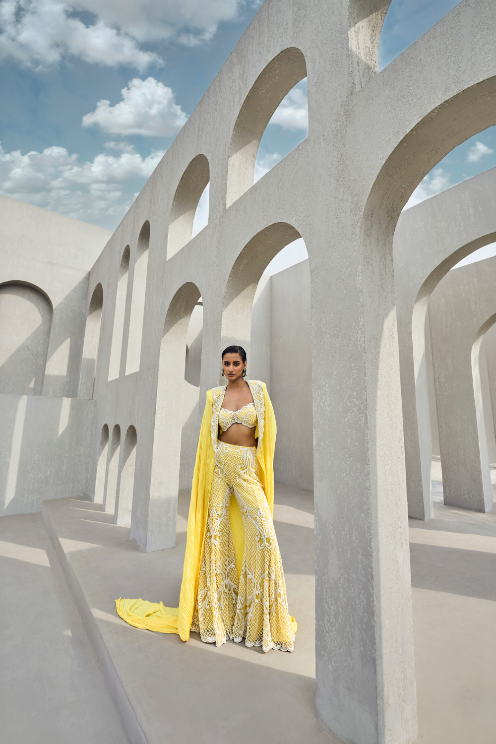 The bralette, sharara, and cape ensemble combines modern, bold femininity with traditional elegance. The bralette shows off the shoulders and midriff, offering a more daring, contemporary edge, while the sharara brings in traditional Indian style with its fluid, voluminous design. The cape elevates the entire look, adding an element of grandeur and ethereal beauty.