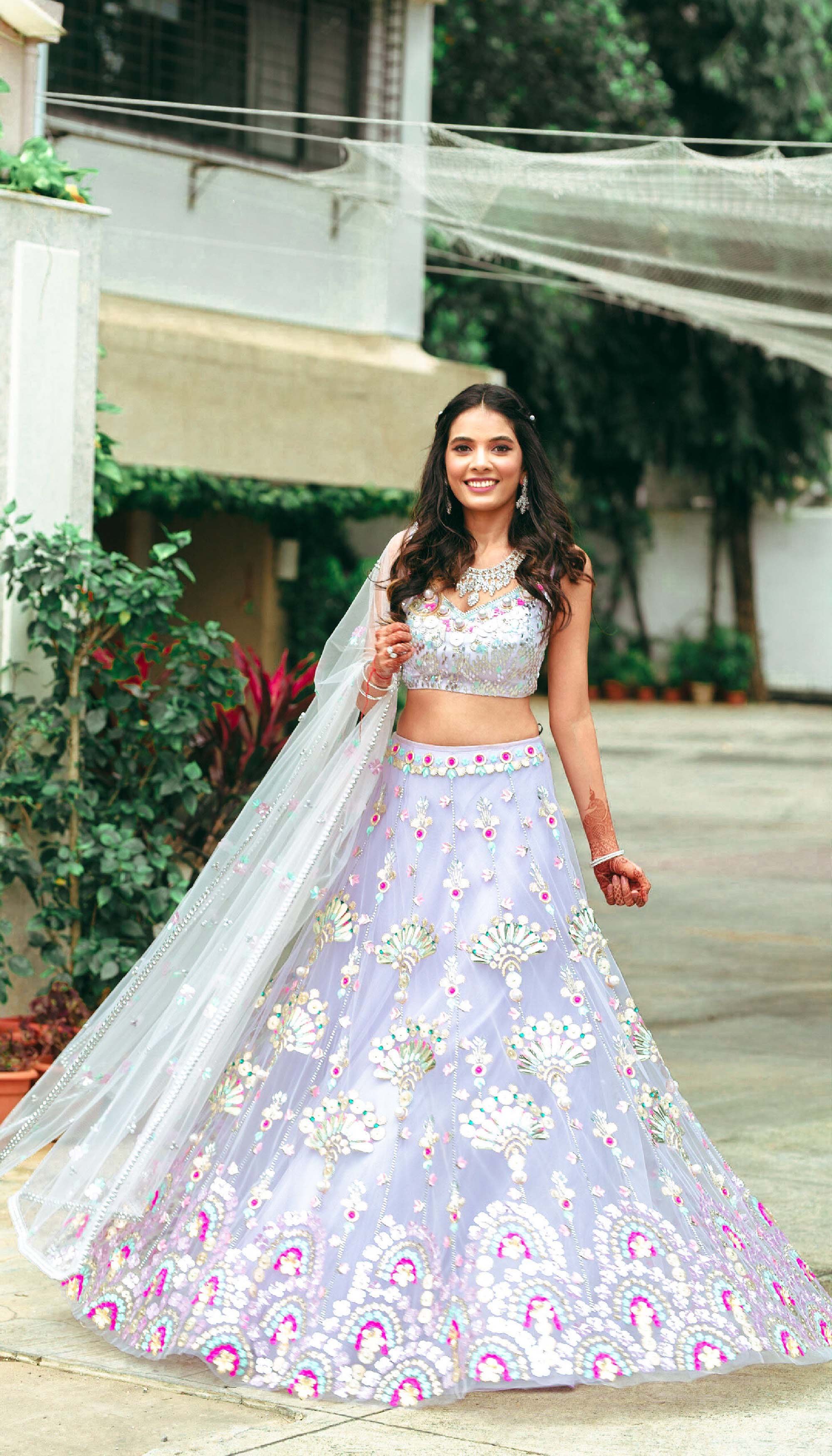 3 part set : Lilac tulle lehenga with silver metallic and sequin embroidery. Paired with a powder blue beads and stones embroidered blouse and tulle dupatta.