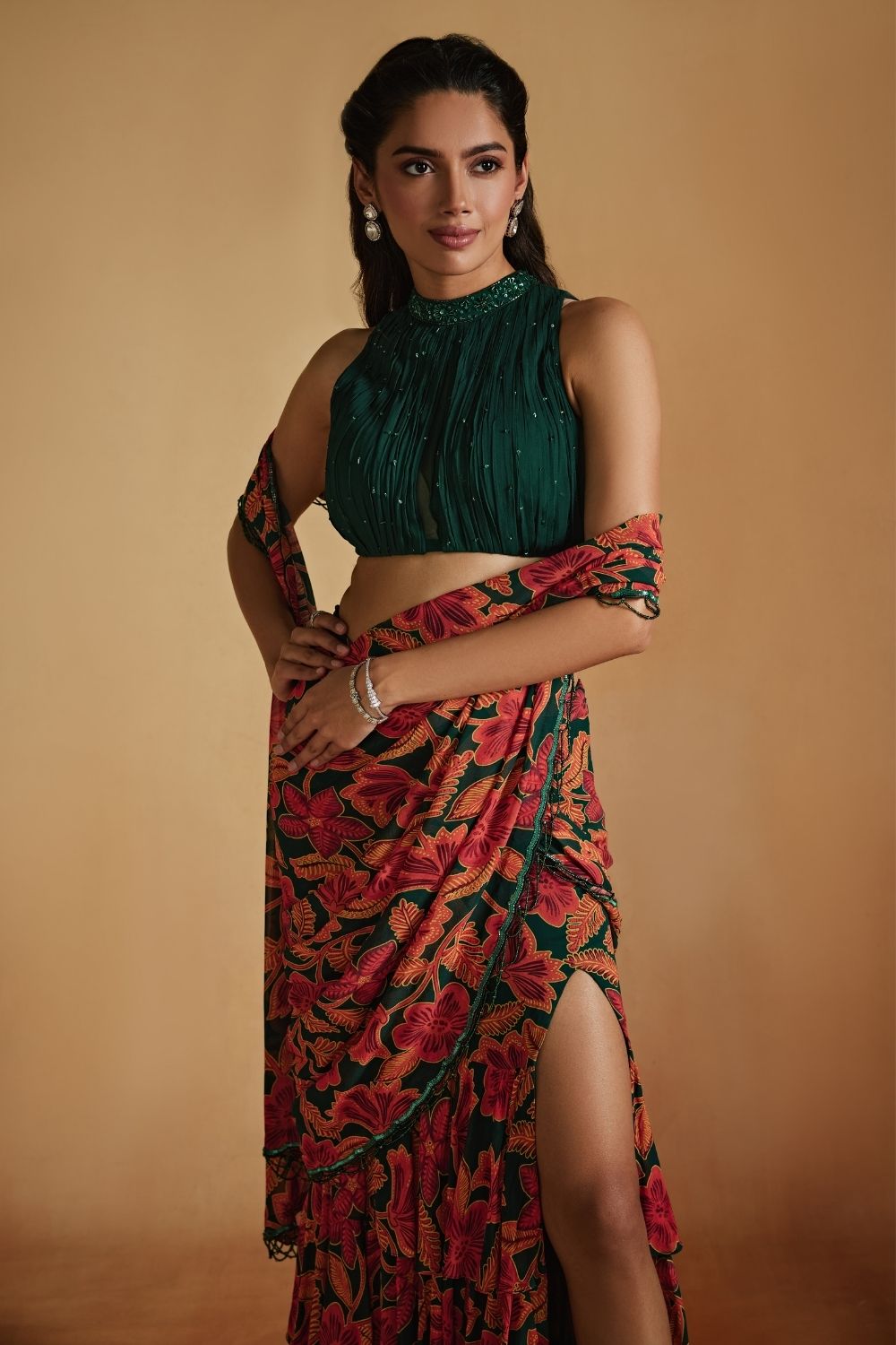 'Green Printed Pre-Draped Saree' is from Inara collection by Sanya Gulati.