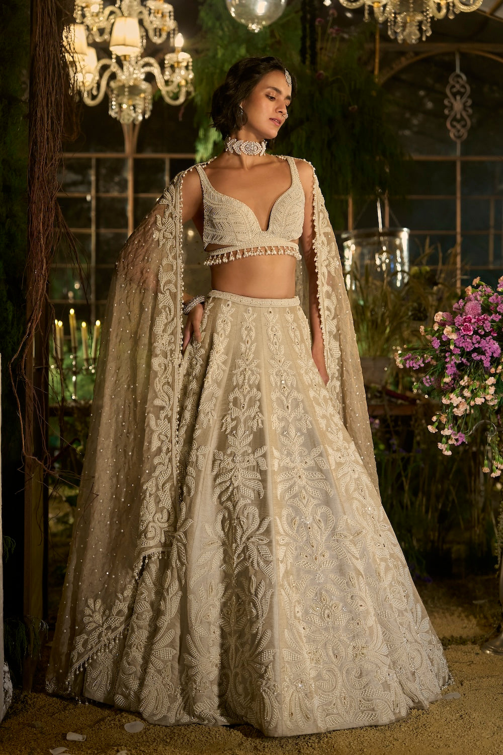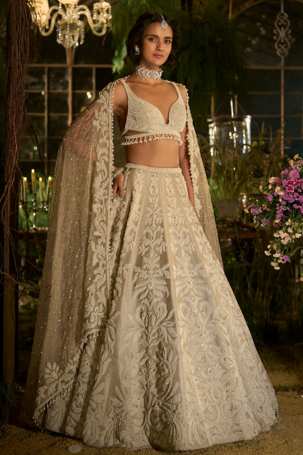 'Champagne Pearl Lehenga Set' is from Eden collection by Seema Gujral. This lehenga set features statement pearl embroidery with fine zardosi outline on a champagne metallic tissue base. The embroidered modern sleeveless stripe pattern blouse has tassels at the waist. It is paired with scalloped embroidered dupatta in sheer tissue organza with pearl tassels all over.