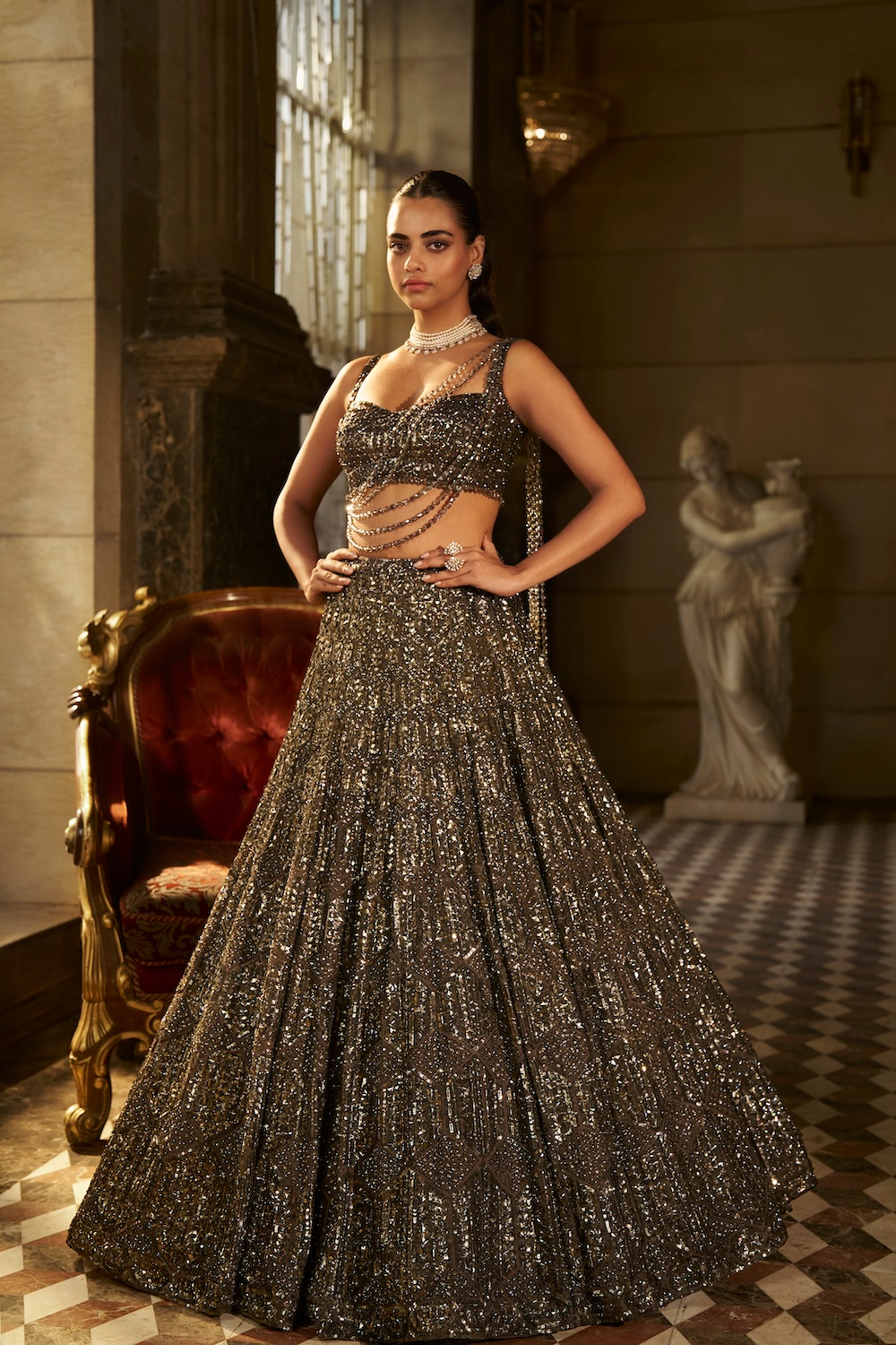 'Charcoal Sequin Lehenga Set' is from Modern Renaissance collection by Seema Gujral. This charcoal lehenga set lehenga features tonal sequin embroidery in varying shapes and sizes - in a geometric pattern The ensemble is paired with a fully embroidered blouse with crystal tassels at the waist and a matching net dupatta with tassels. Crystal accessories can be used to style this outfit.