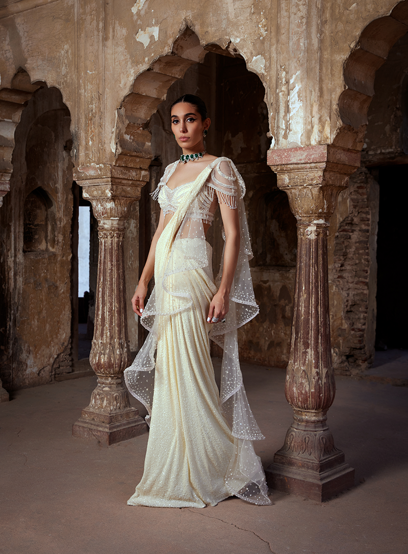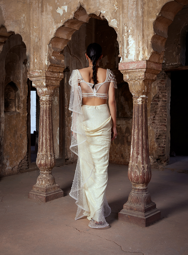 Product Description: Delicately Embroidered Blouse With Tassel Details Paired With Sequin Pleated Sari And Attached Tulle Pearl Embroidered Ruffle Pallu Work: Pearl and Crystal