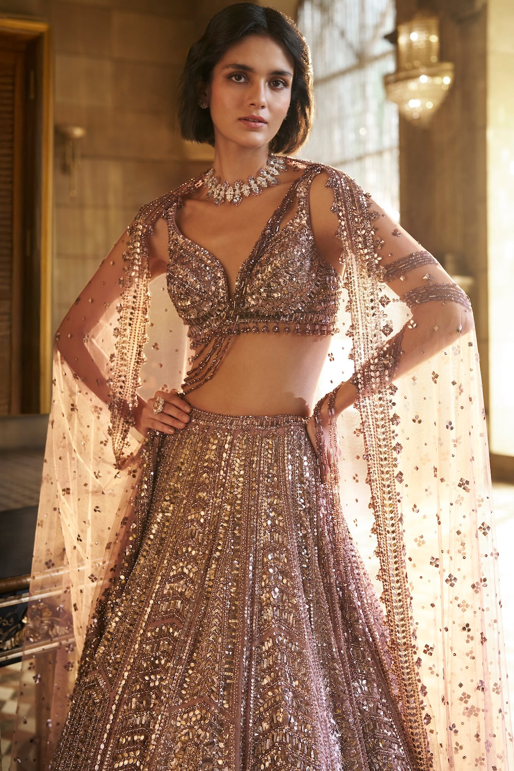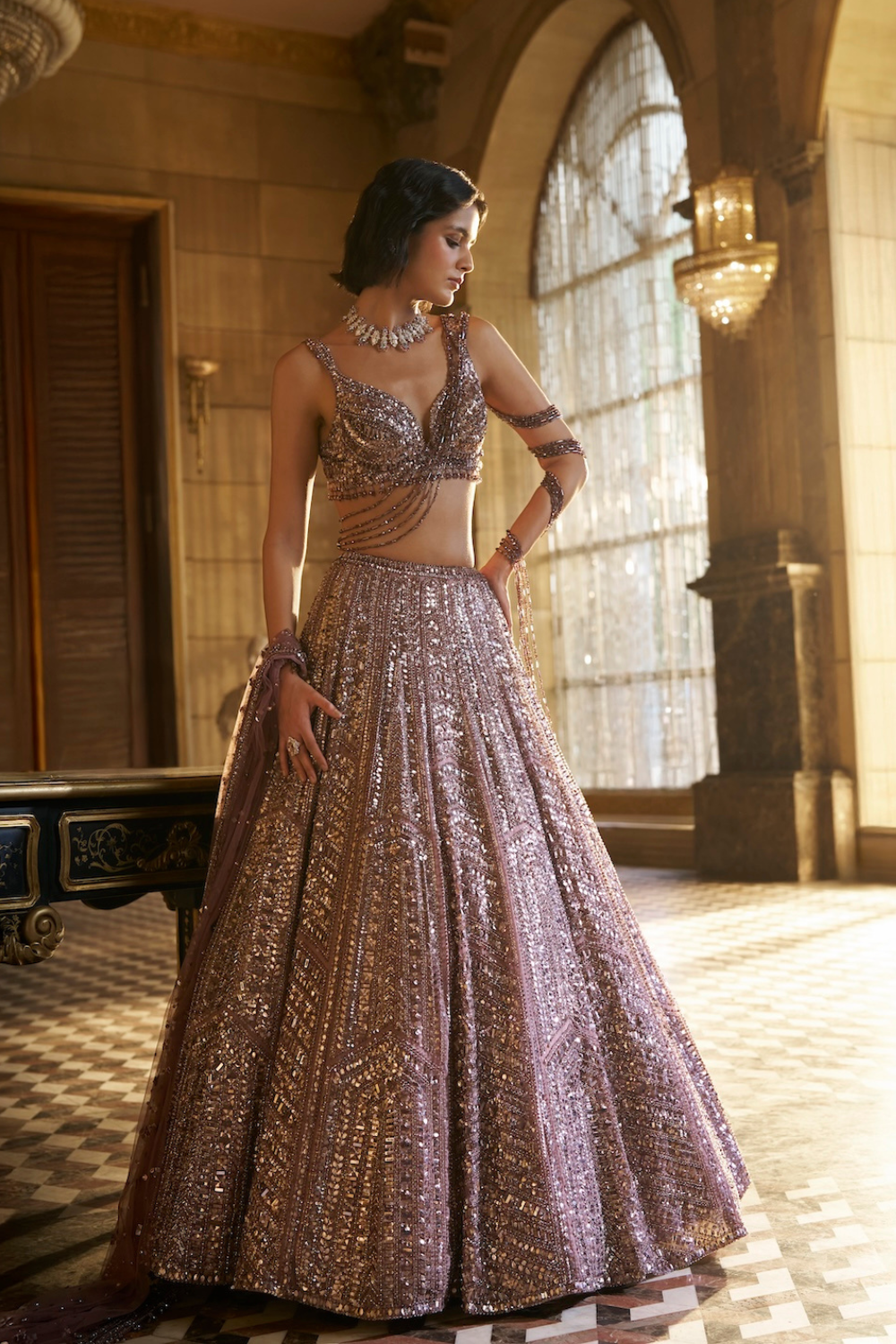 'Dusty Mauve Sequin Lehenga Set' is from Modern Renaissance collection by Seema Gujral. This dusty mauve lehenga set lehenga set features tonal sequin embroidery in varying shapes and sizes -in a geometric pattern. The ensemble is paired with a fully embroidered blouse with crystal tassels at the waist and a matching net dupatta with tassels. Crystal accessories can be used to style this outfit.