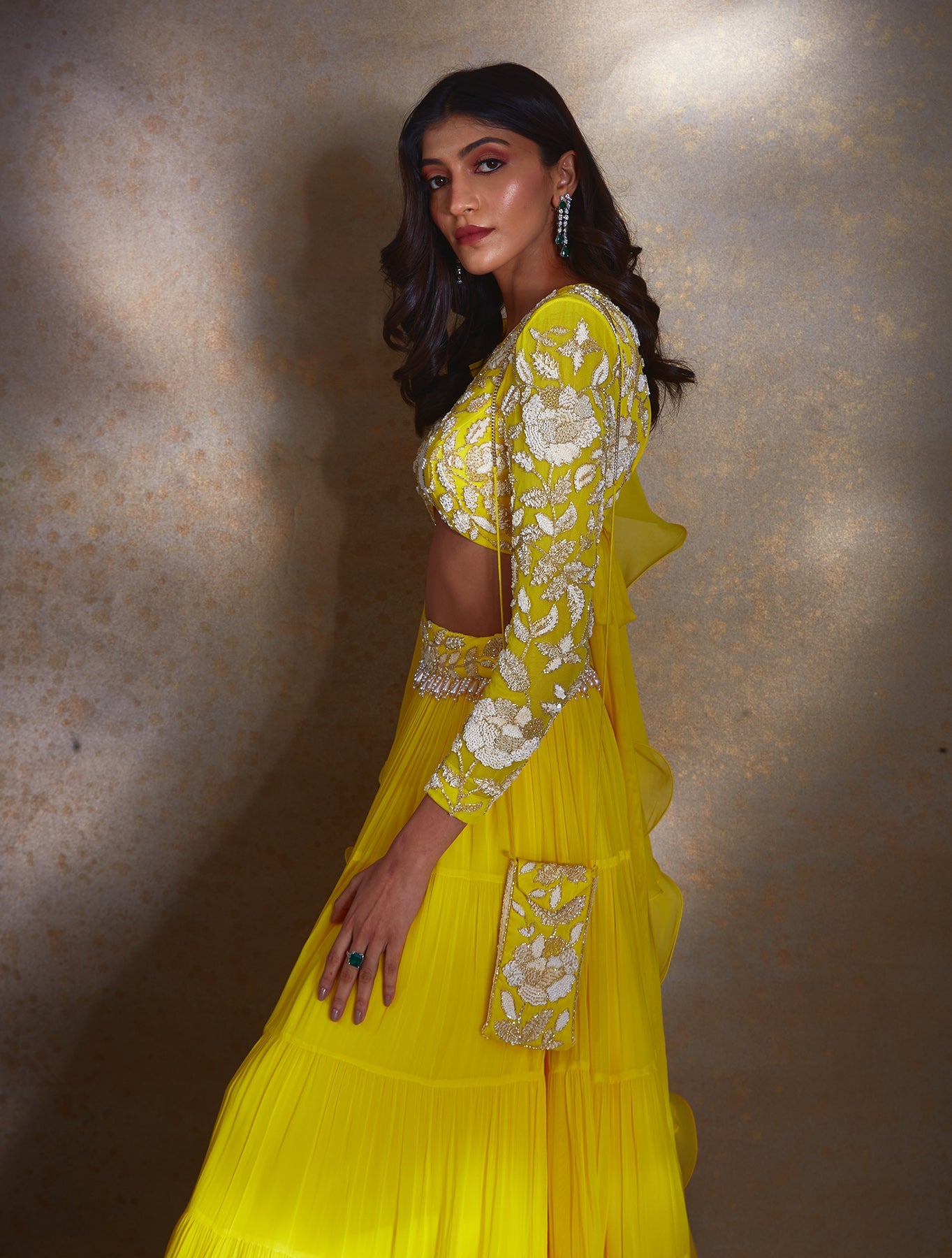 'Ellen Phone Cover' is from Winter Sun collection by Shloka Khialani. Yellow phone cover hand embellished with ivory & silver camellia florals with a cord & white gold metal strap. Designed to match the Luna Sari & Ellen Lehenga.