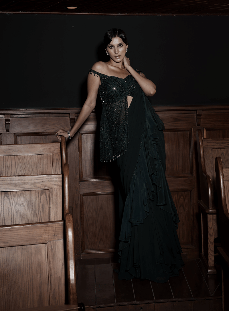 'Half Jacket Embroidered Blouse With Raffle Drape' is from Saree collection by Kamaali Couture. Product Description: Embroidered jacket sari with Sharara