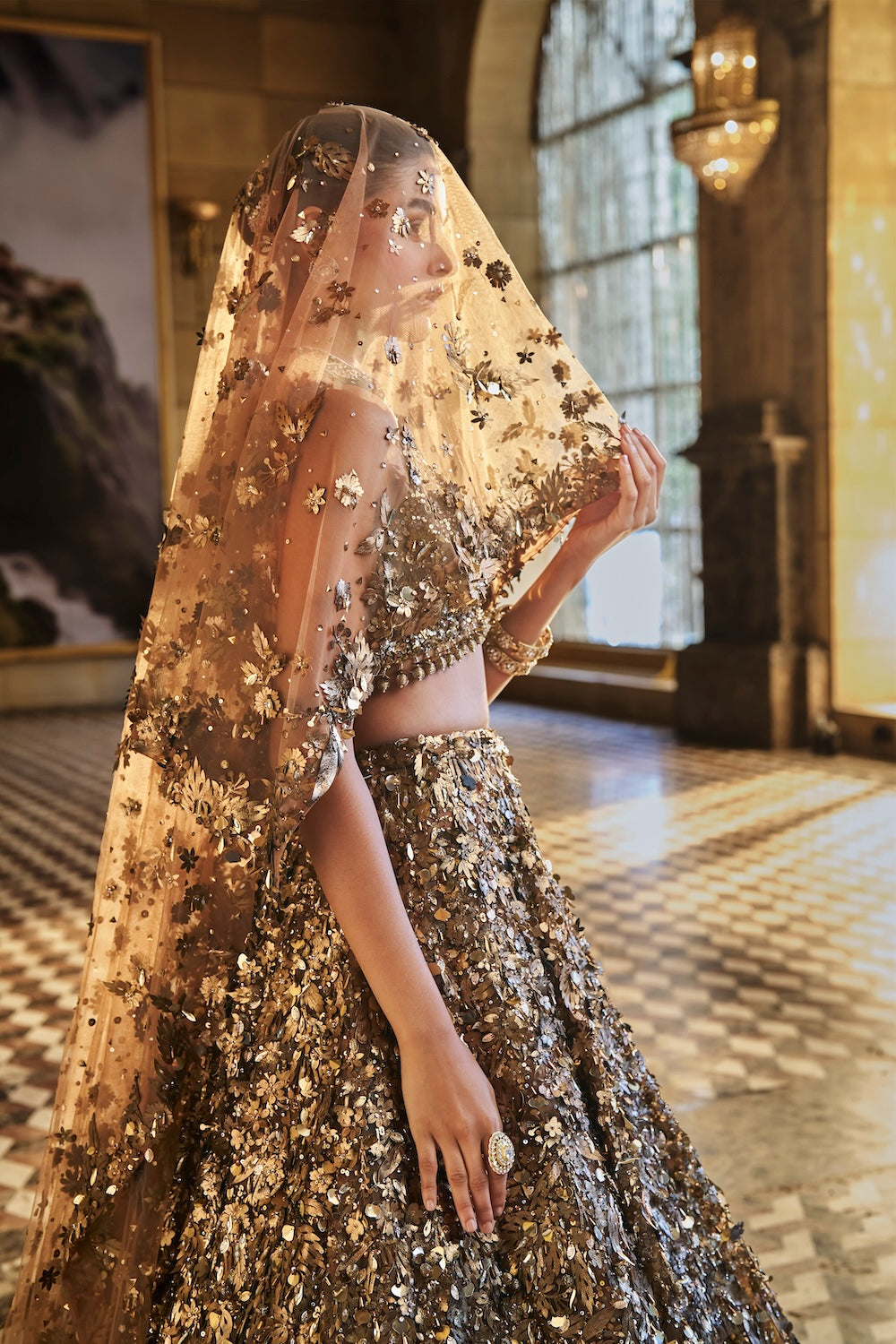 'Metallic Gold 3D Lehenga Set' is from Modern Renaissance collection by Seema Gujral. This lehenga set features three-dimensional metallic gold applique work highlighted with crystal and sequin.The blouse shows crystal tassels at the waist. Embroidered dupatta also shows crystal tassels on all four sides.