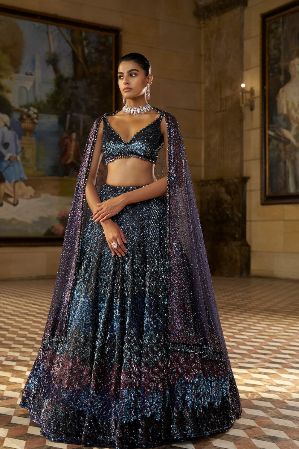 'Multi - Coloured Sequin Lehenga Set' is from Modern Renaissance collection by Seema Gujral. This sequin lehenga set features embroidery in jewel tones in an ombre pattern. The ensemble is paired with a sleeveless blouse with tassels at the waist and a matching net dupatta.