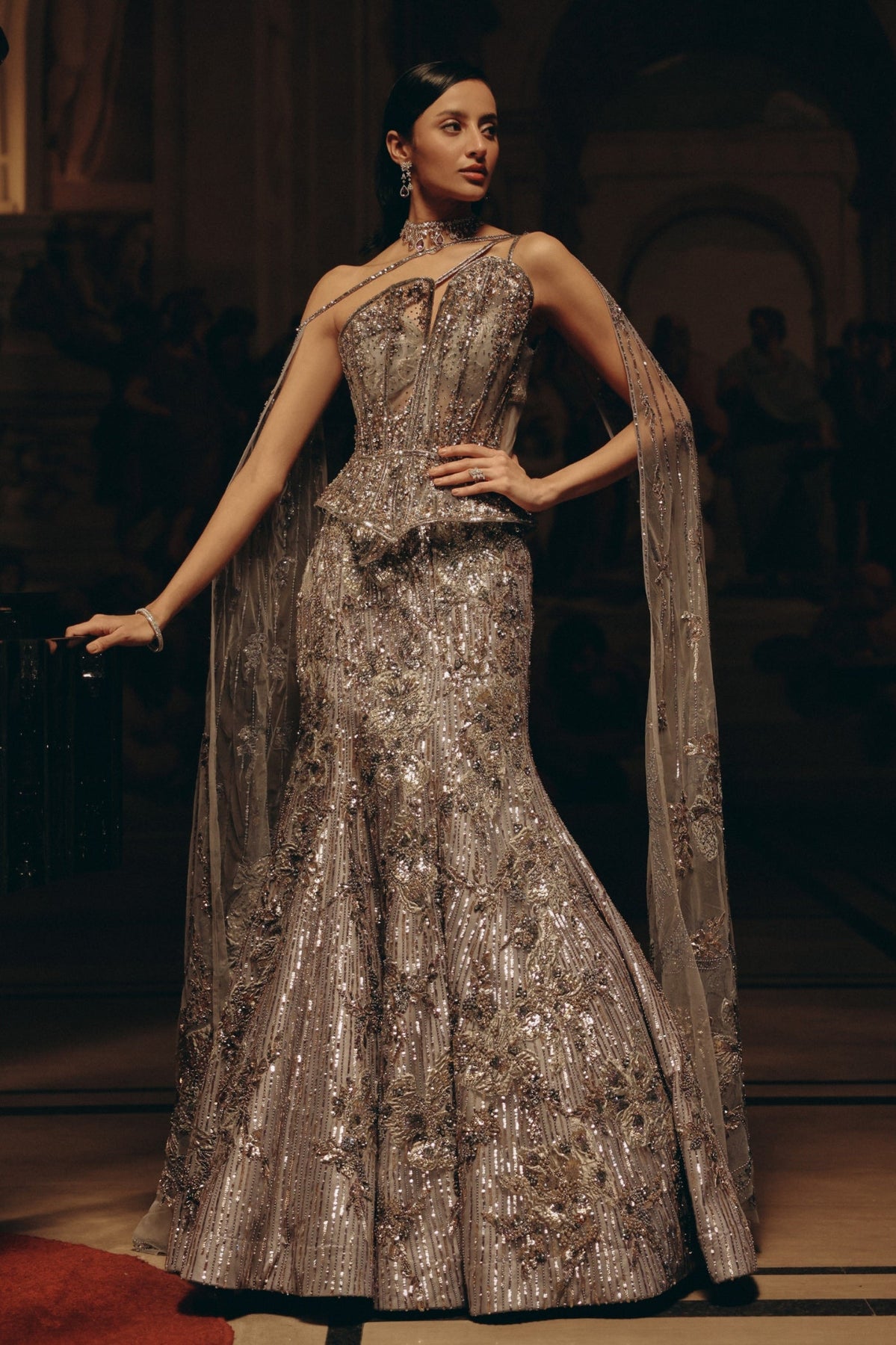 'Starlit Symphony Top And Skirt' is from Notte collection by Adaara Couture. An ode to celestial grandeur, this silver corset bodice redefines evening couture with its sculpted and flared mermaid silhouette. The intricate hand embroidery, shimmering sequins, and crystal beadwork create a starlit radiance, while the off-shoulder drape cascades gracefully, adding fluid elegance to its structured form. A perfect balance of power and poise, this ensemble embodies modern royalty.