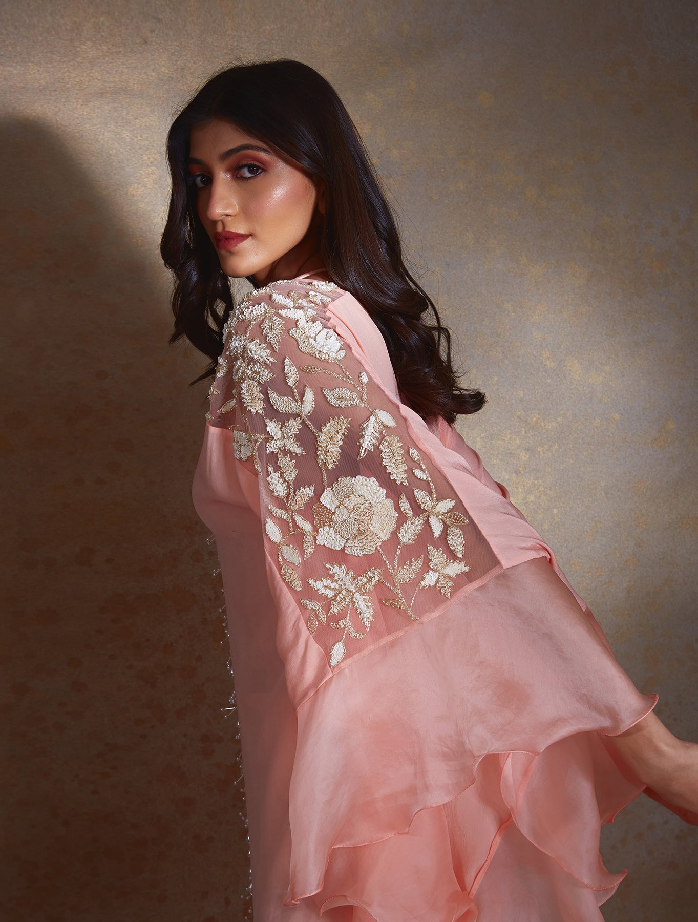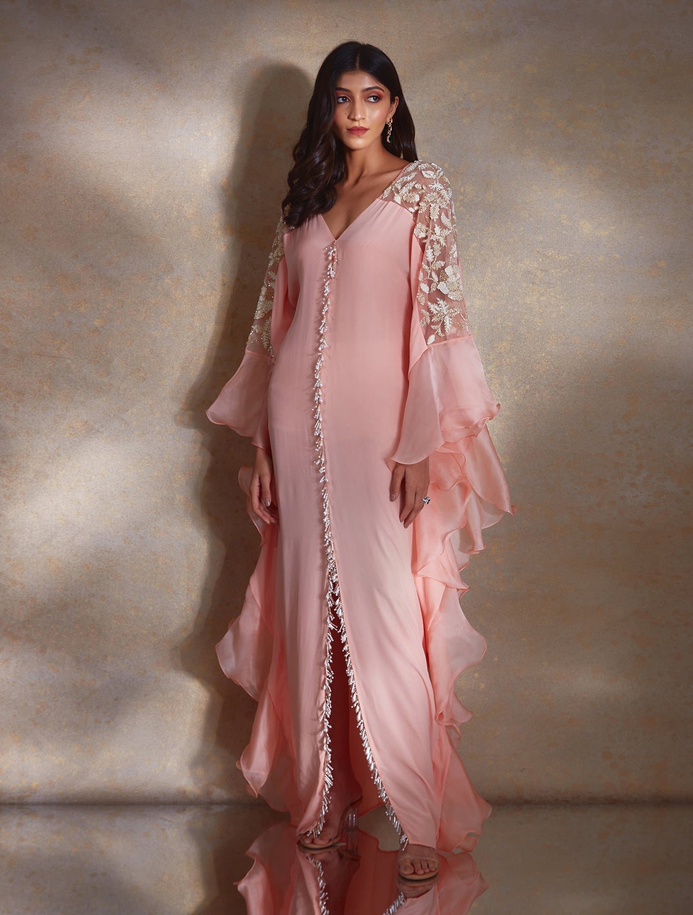 'Cece' is from Winter Sun collection by Shloka Khialani. Peach crepe kaftan with organza ruffles featuring net hand embellished shoulder panels with ivory camellia florals & pearl drops on the front and slit