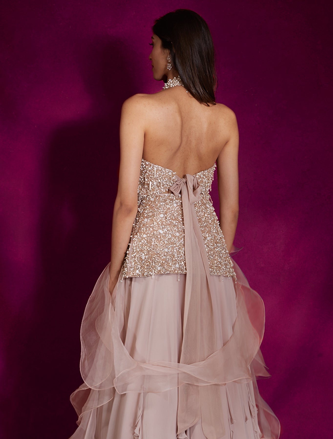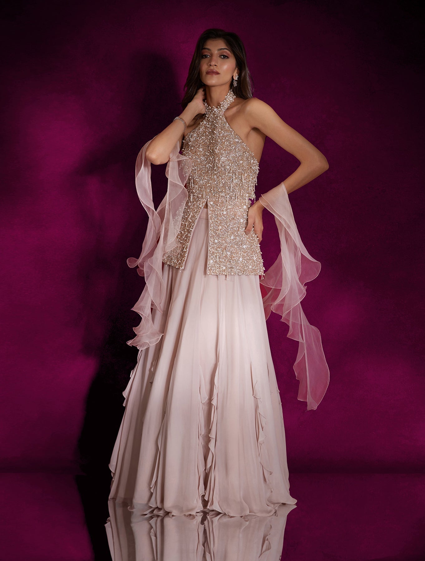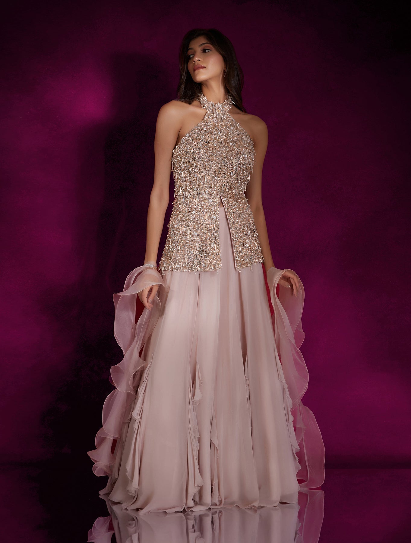 'Chloe' is from Winter Sun collection by Shloka Khialani. Dusty pink high neck peplum top heavily hand embellished with ivory pearls & silver glass beads and tassels, paired with a georgette lehenga with ruffles & an organza ruffle dupatta