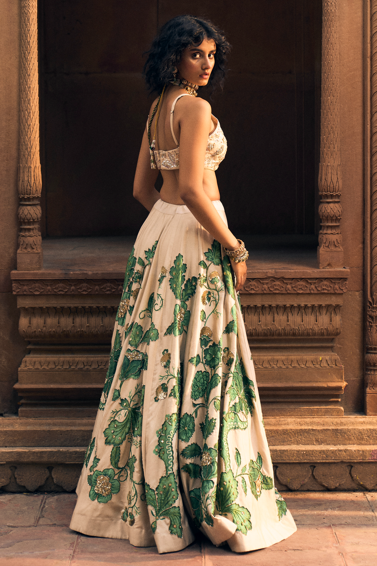 An ivory and green floral print lehenga, featuring intricate hand-embroidery in aari, zardozi and sequins. It is paired with a signature cut printed and hand-embroidered blouse in floral inspired motifs. The look is complete with a delicate floral printed organza dupatta with double scallop embroidered borders. SKU: PH-2473 Material Lehenga: Chiniya Silk Blouse: Chiniya Silk Dupatta: Banarasi Organza – Blouse: Fitted at bust Lined Padded front Back hook opening – Lehenga: Fitted at the waist Lined Has a can can Side zip and drawstring opening Size Guide