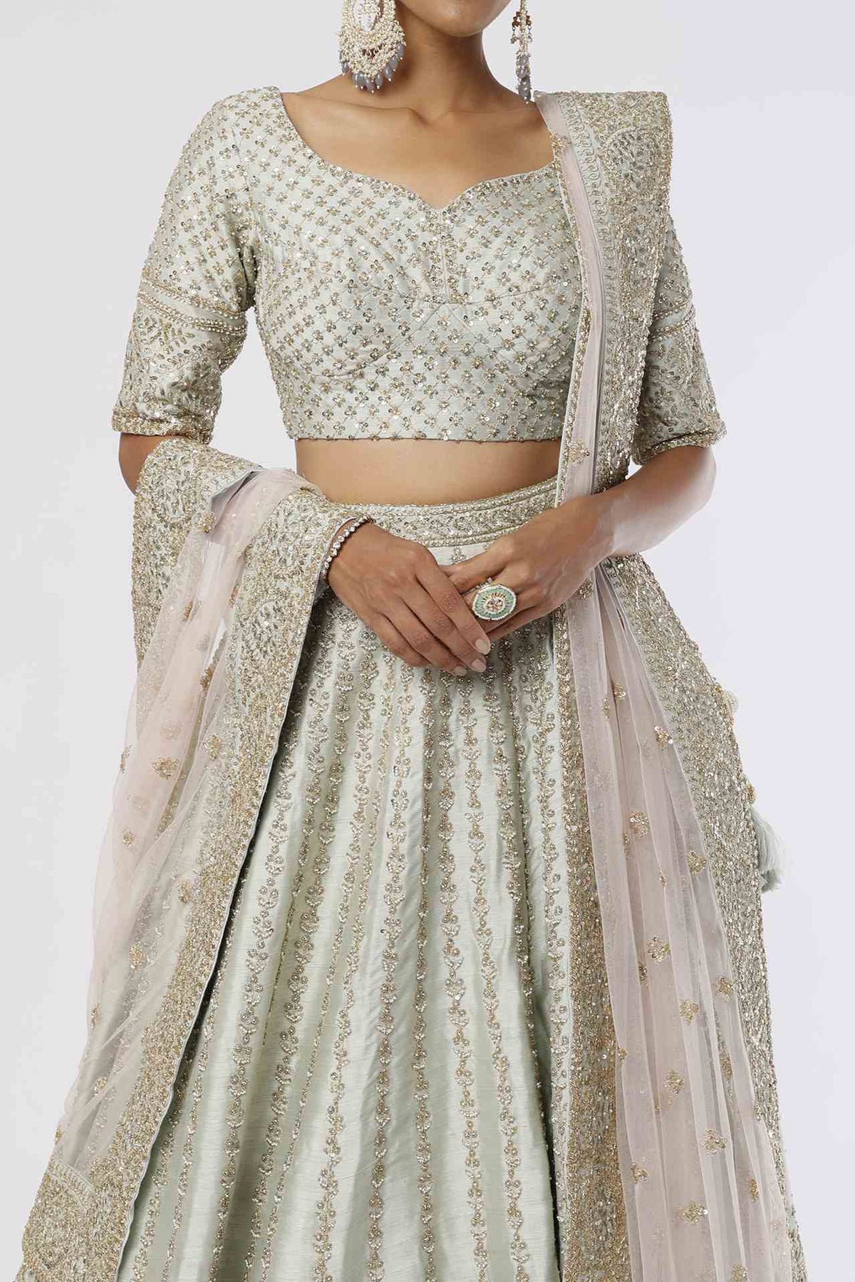 Featuring A Peach Lehenga In Raw Silk Base With Zardosi Embellishments Including Cancan. It Is Paired With A Matching Blouse Having Maal Work And A Dupatta.