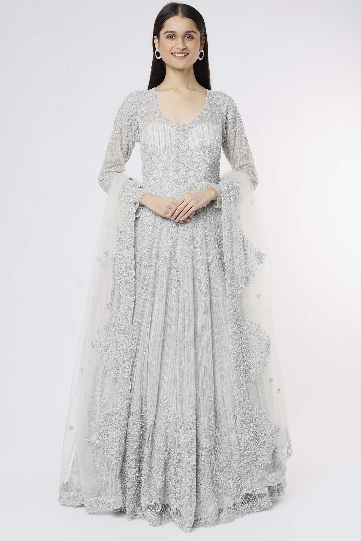 'Grey Hand Embellished Gown' is from Zardoz collection by Kalighata. Featuring A Grey Gown In Net Base With Sequins And Cutdana Hand Embellishments. It Is Paired With A Matching Dupatta.