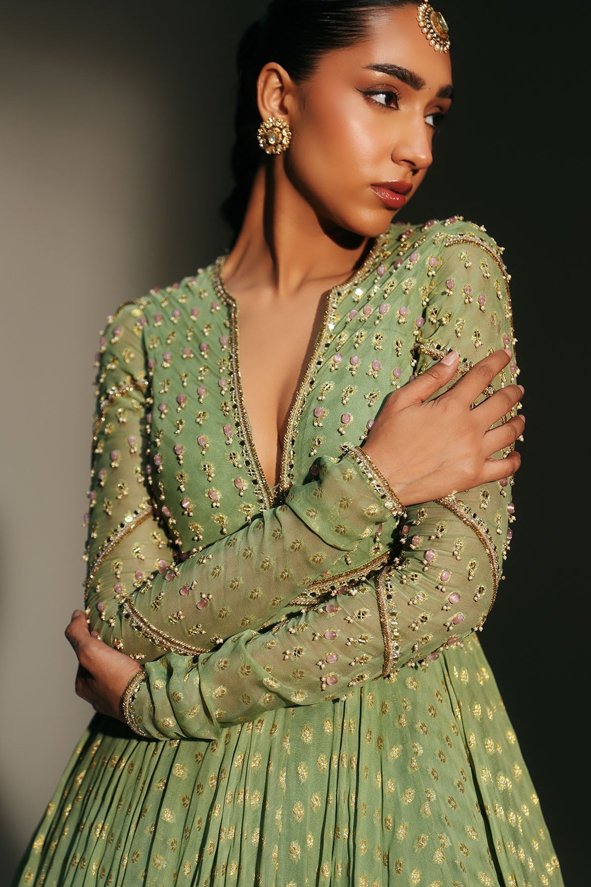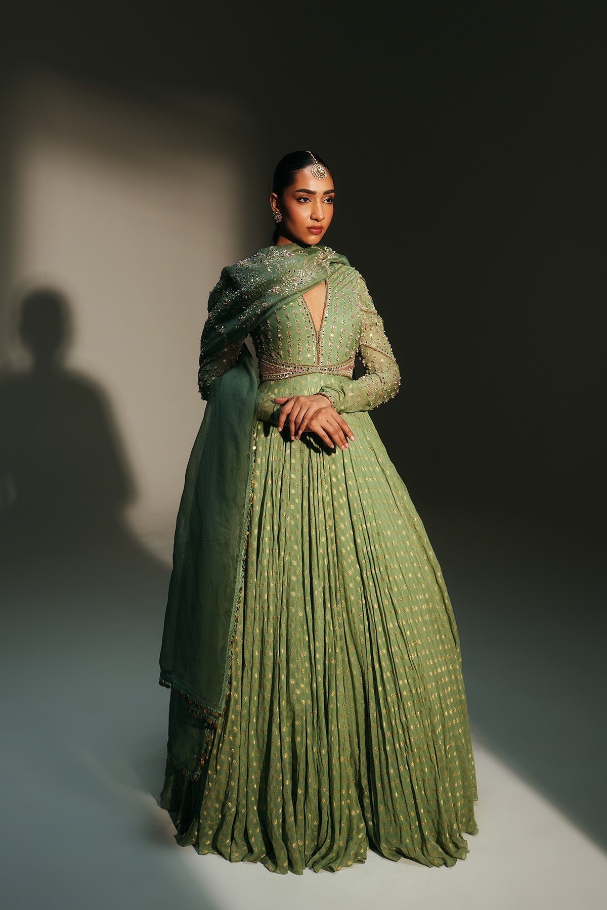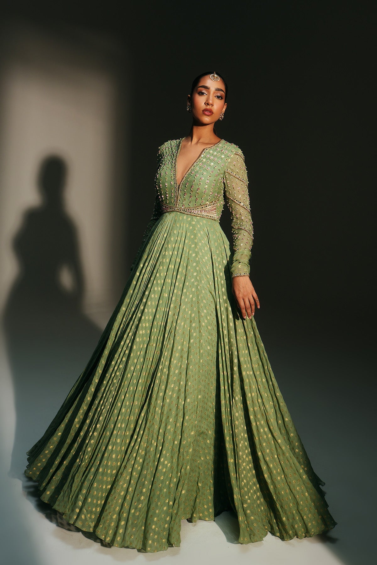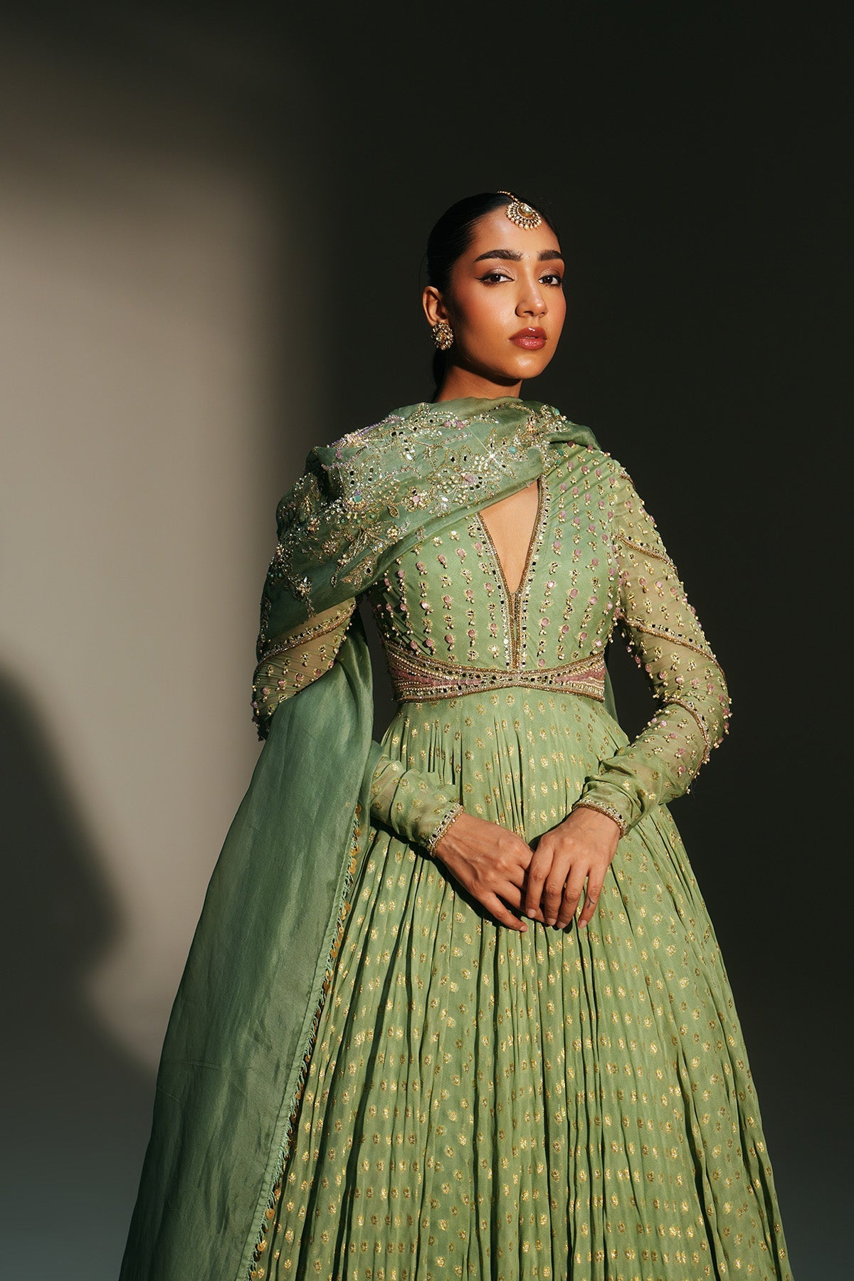 'Chaya' is from Mehfil collection by Mahima Mahajan. HAND EMBROIDERED PISTA GREEN FULL SLEEVES ANARKALI PAIRED WITH MATCHING EMBROIDERED DUPATTA
