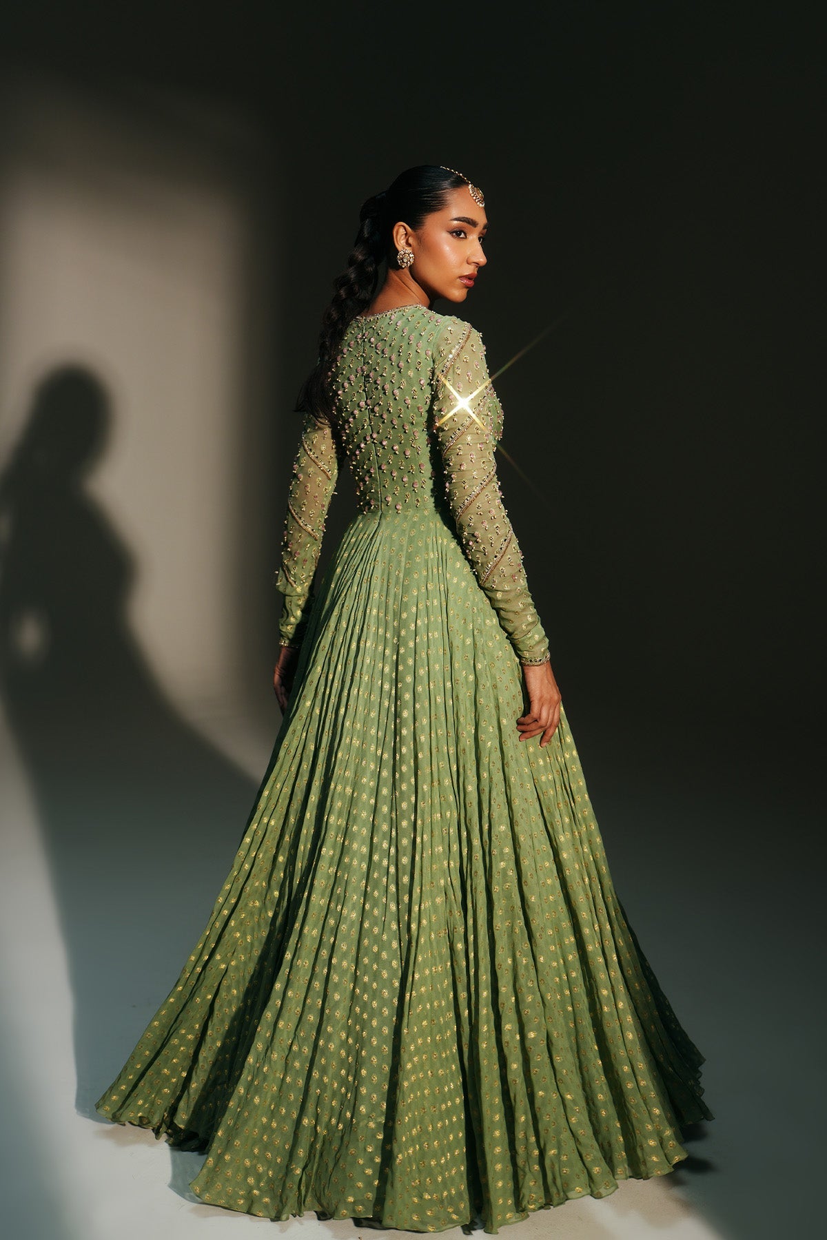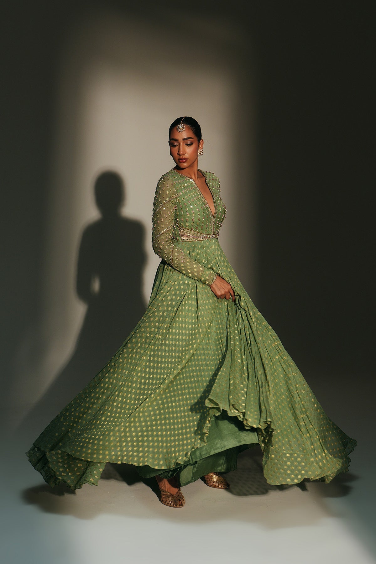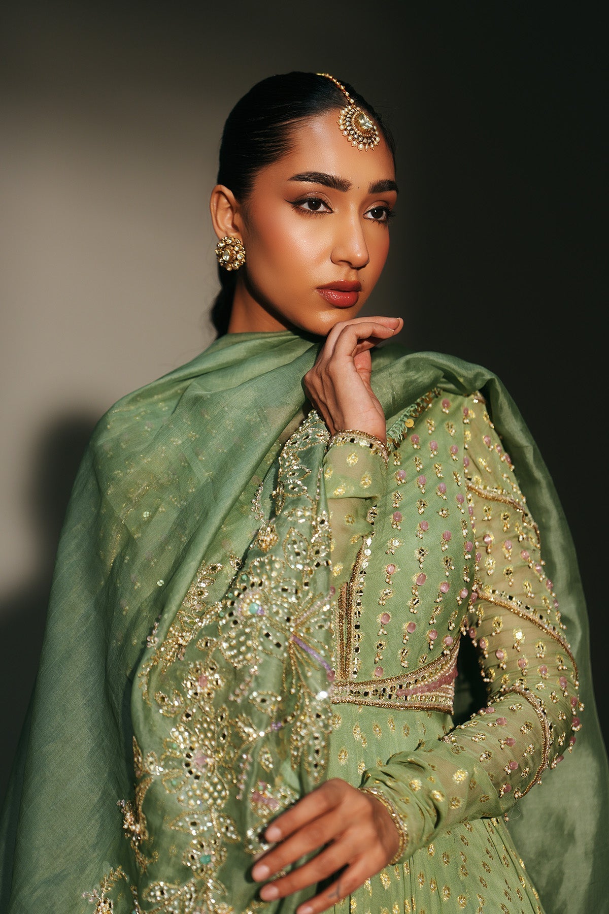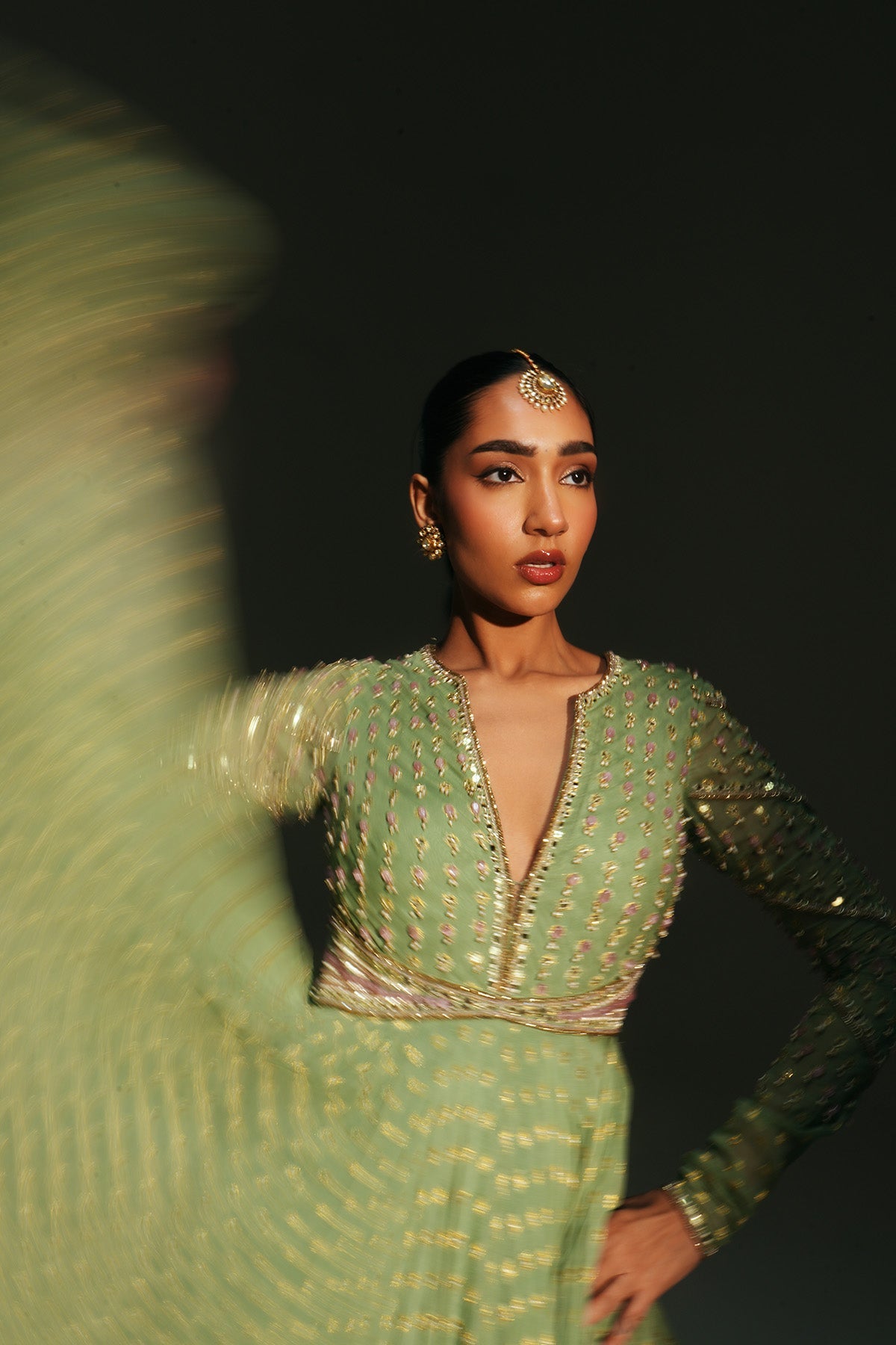 'Chaya' is from Mehfil collection by Mahima Mahajan. HAND EMBROIDERED PISTA GREEN FULL SLEEVES ANARKALI PAIRED WITH MATCHING EMBROIDERED DUPATTA
