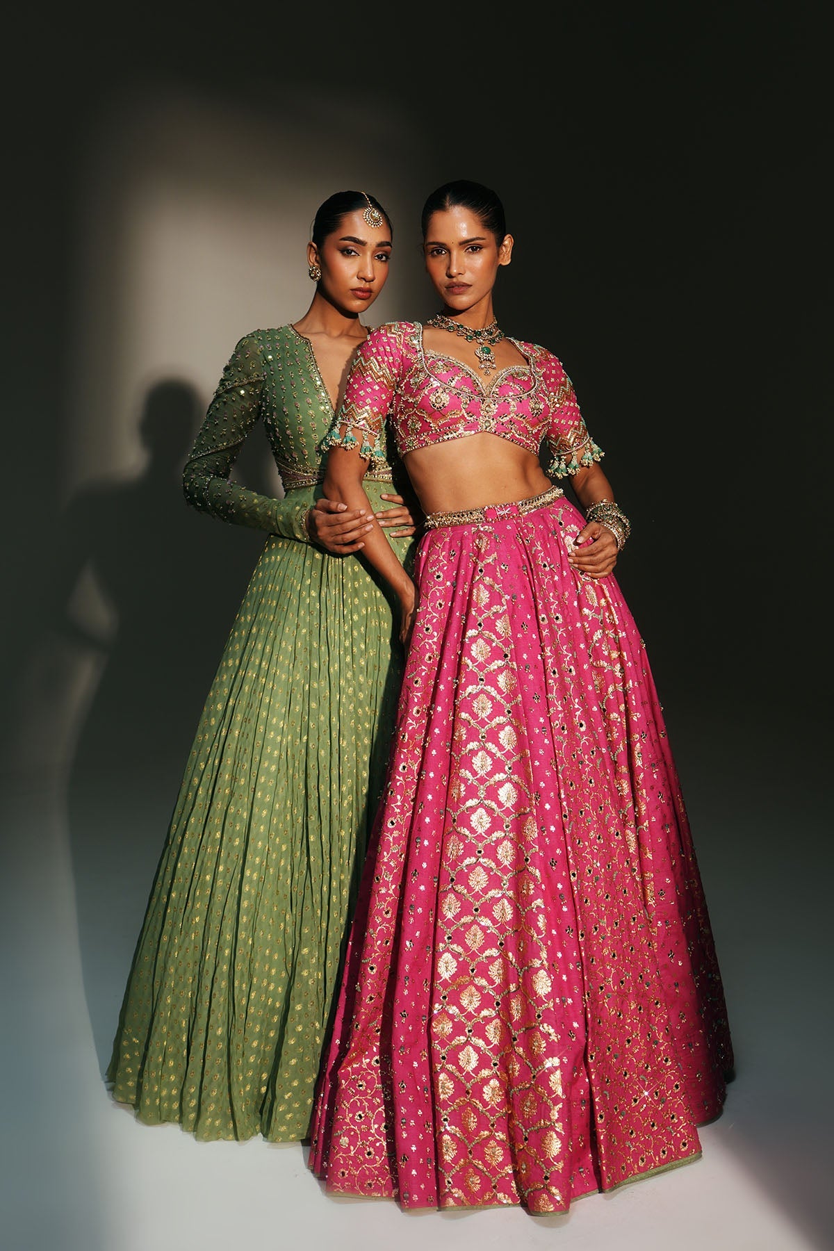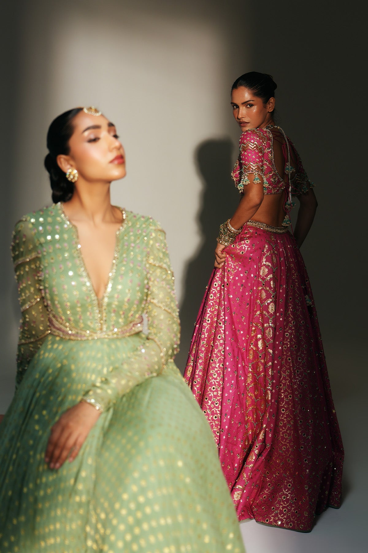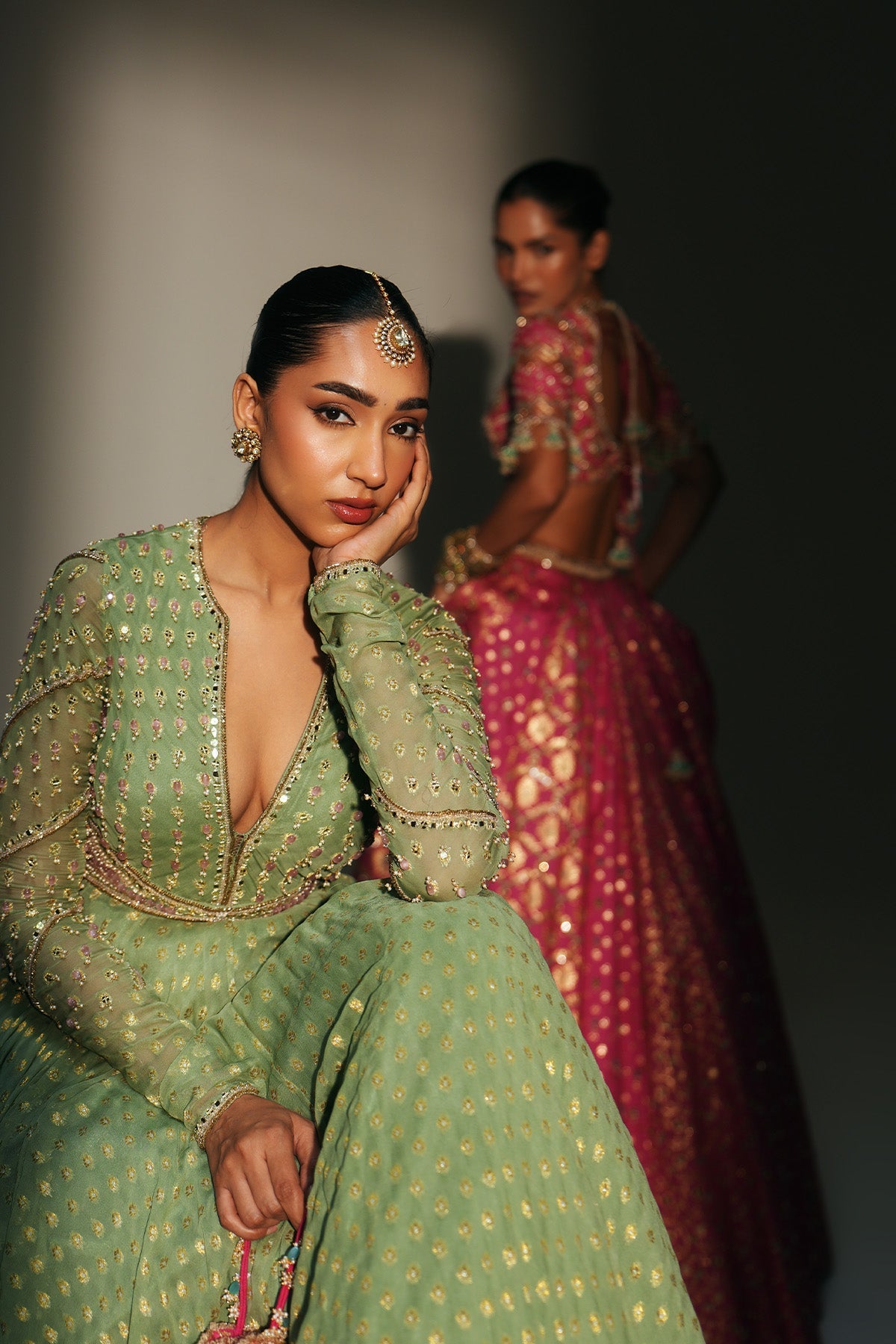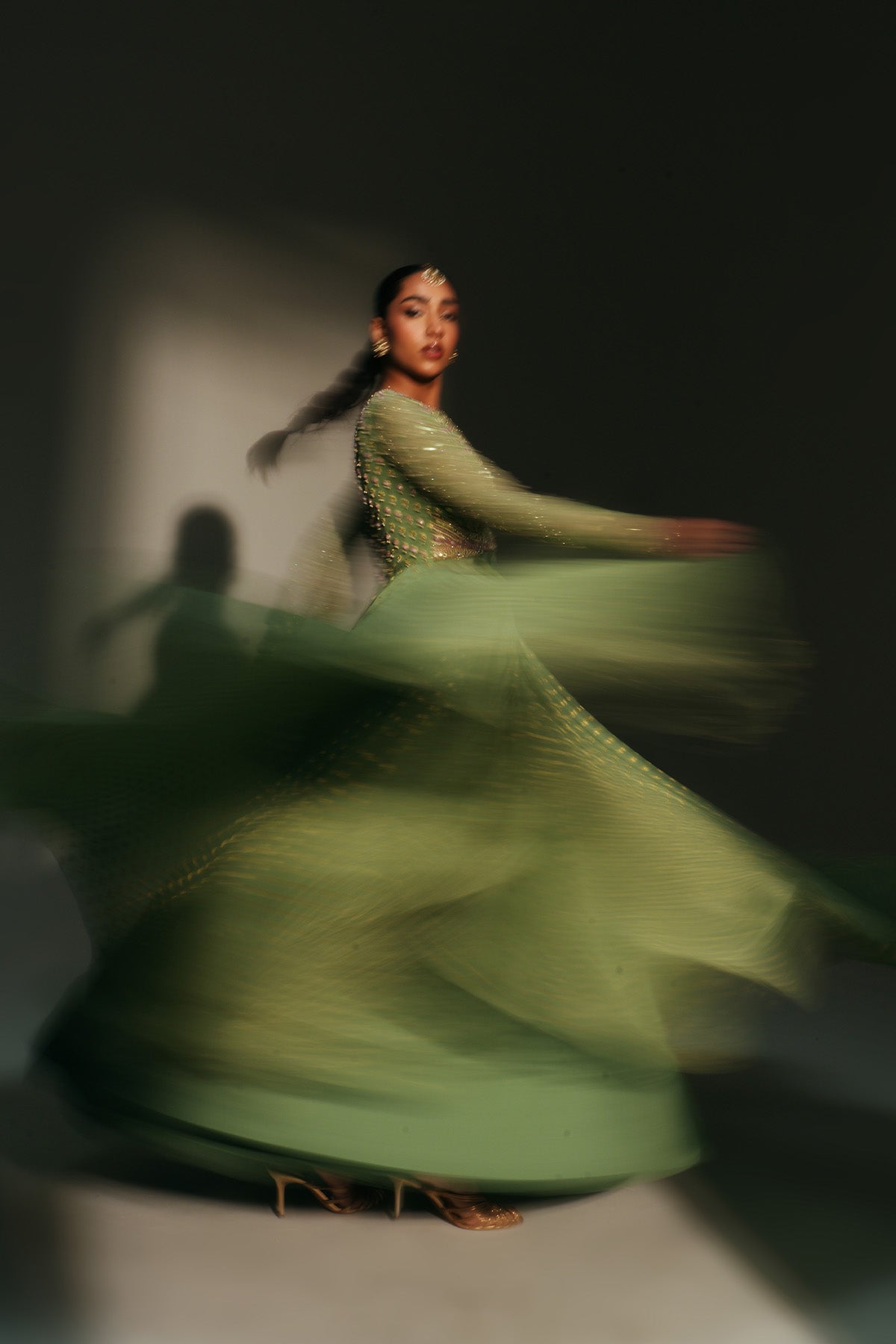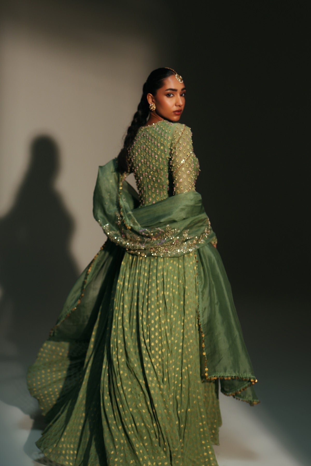 'Chaya' is from Mehfil collection by Mahima Mahajan. HAND EMBROIDERED PISTA GREEN FULL SLEEVES ANARKALI PAIRED WITH MATCHING EMBROIDERED DUPATTA