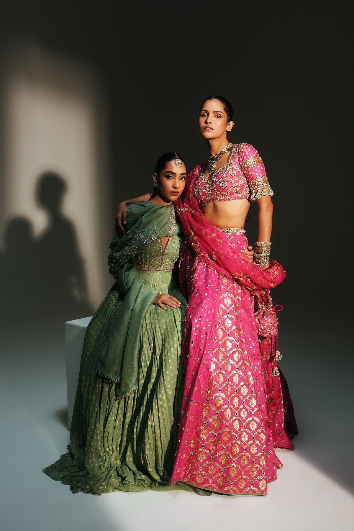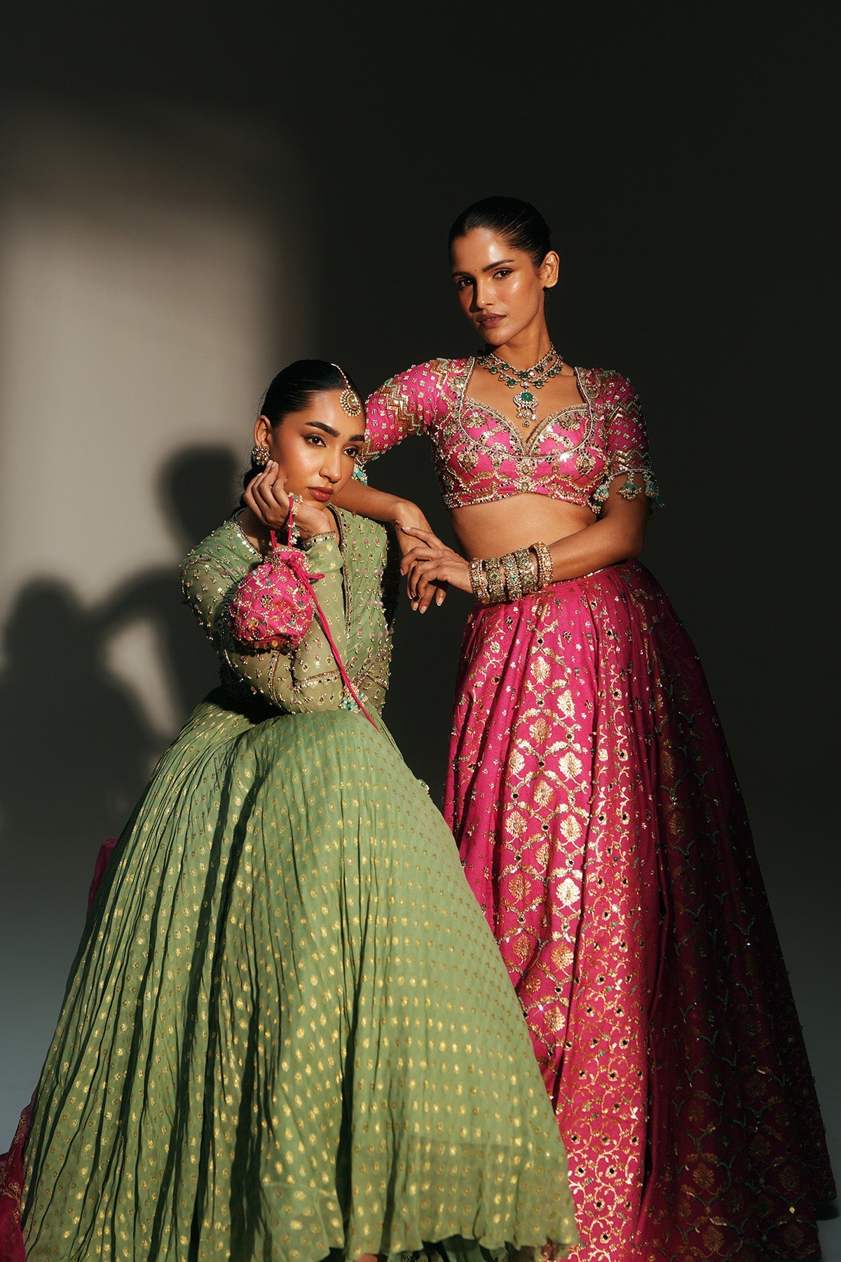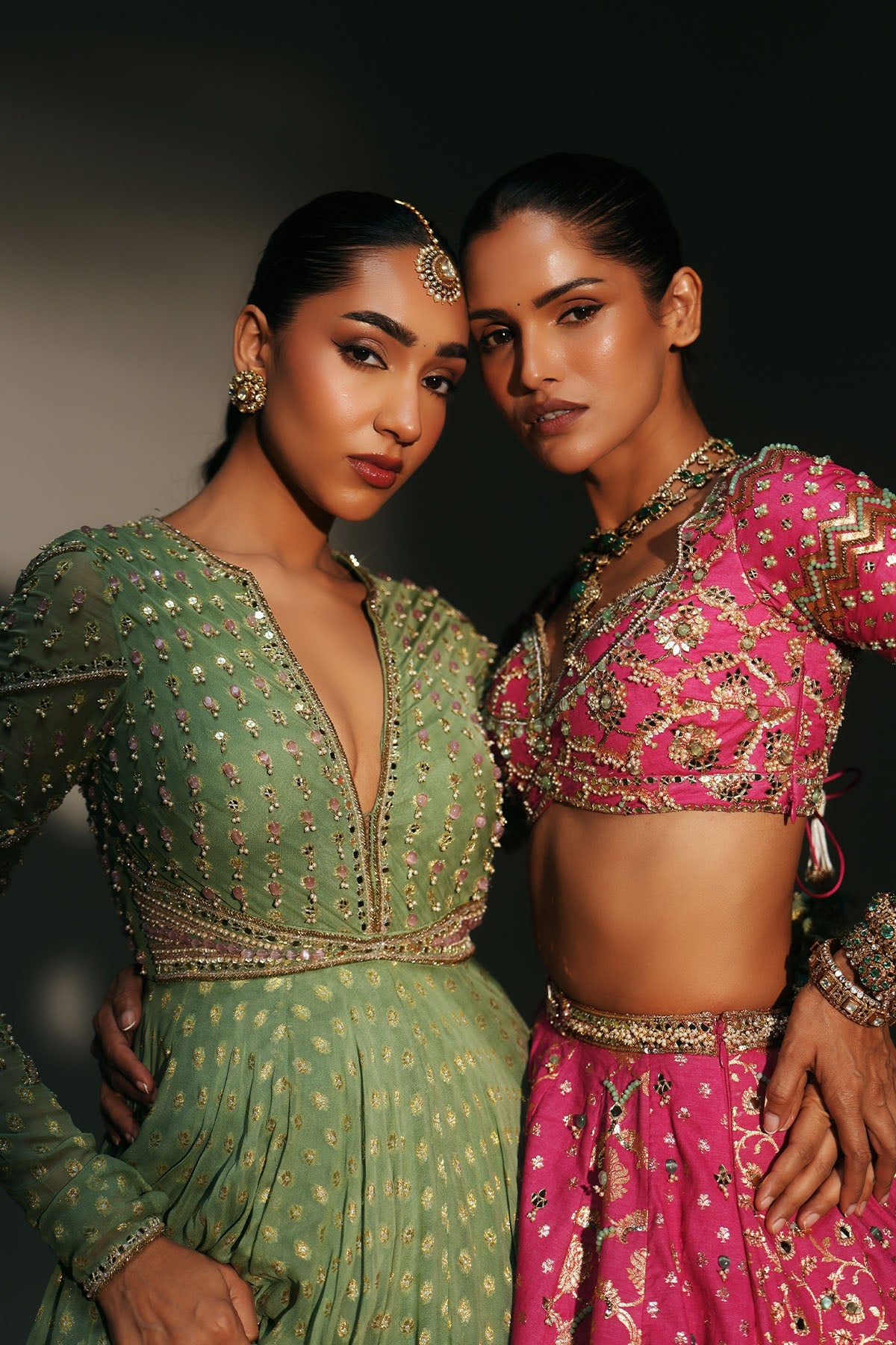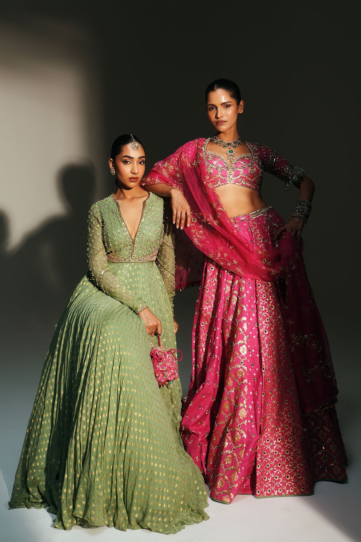 'Chaya' is from Mehfil collection by Mahima Mahajan. HAND EMBROIDERED PISTA GREEN FULL SLEEVES ANARKALI PAIRED WITH MATCHING EMBROIDERED DUPATTA