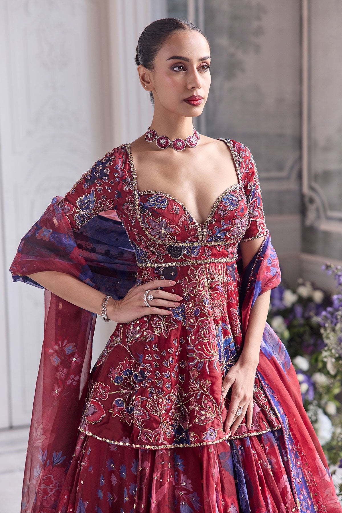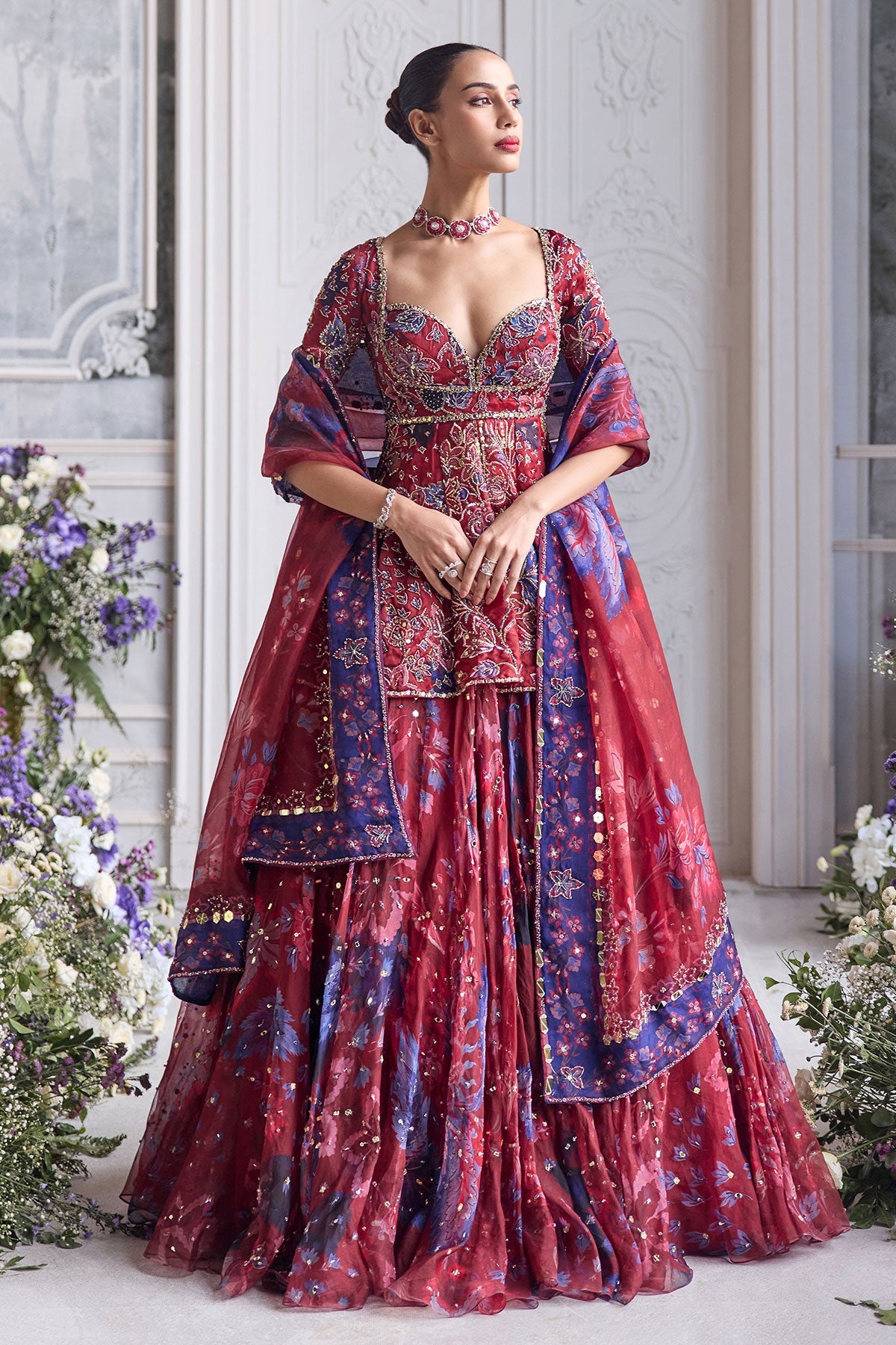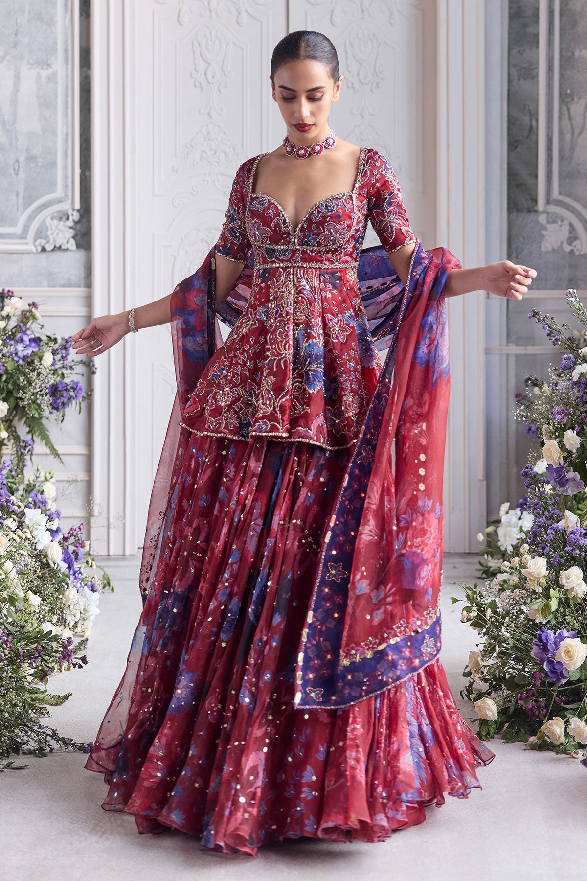 'Selina' is from Fanah collection by Mahima Mahajan. HEAVY EMBROIDERED PEPLUM KURTA PAIREDD WITH EMBROIDERED LEHENGA AND DUPATTA